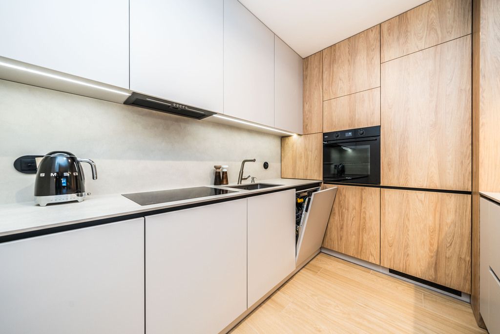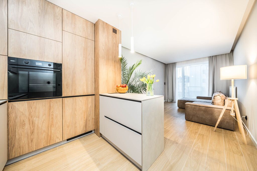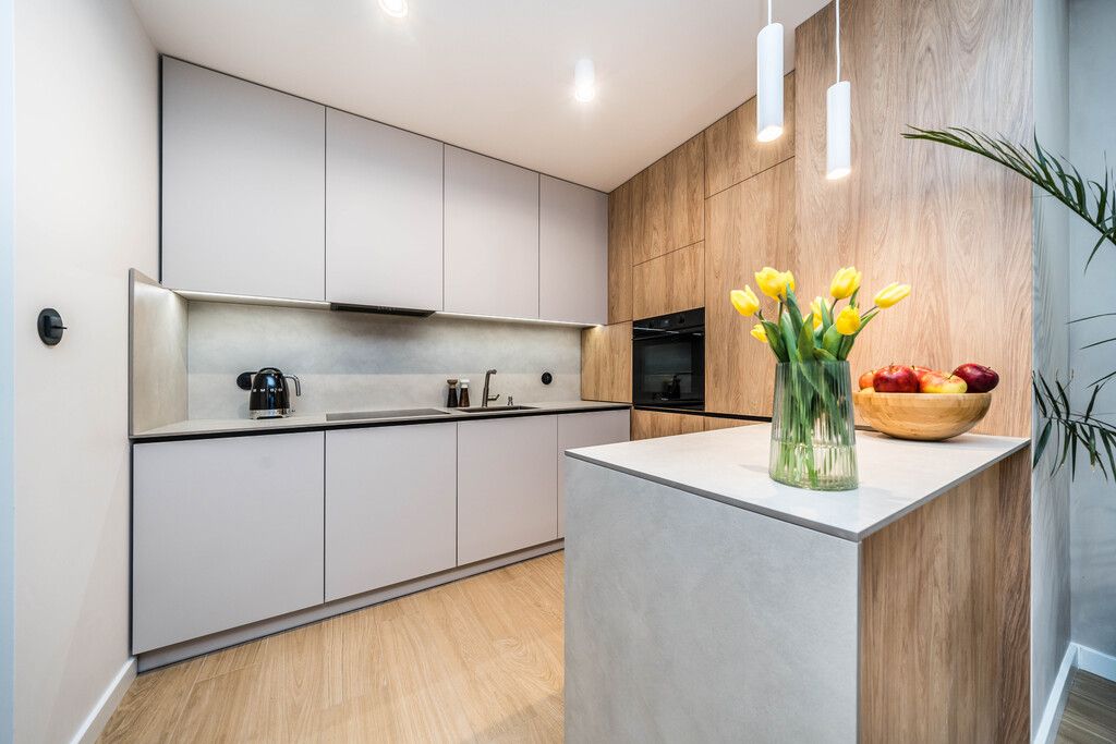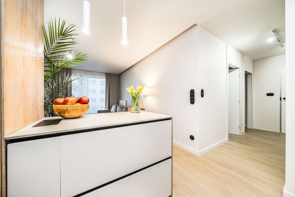 W części kuchennej znajduje się modna wyspa z blatem roboczym, gdzie wbudowano kontakty. Zabudowa meblowa zawiera również wysuwaną zamykaną szufladę na ekspres do kawy. Każdy element jest tu bardzo przemyślany.
