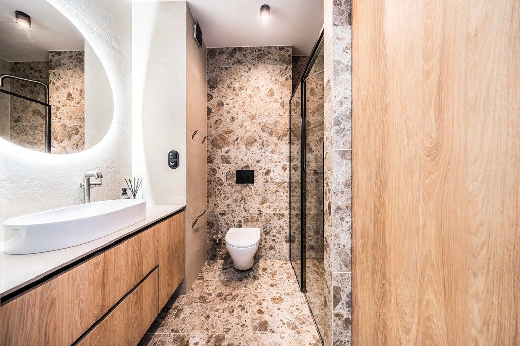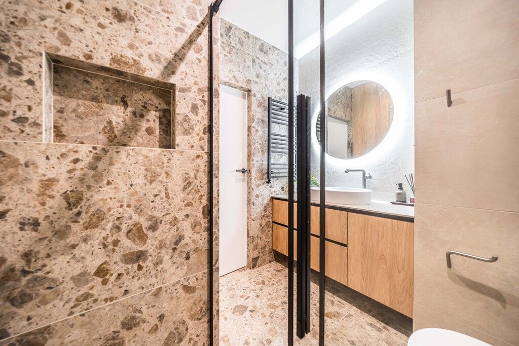 - łazienka z przestronnym bezprogowym prysznicem (jest tu też duża zabudowa na kosmetyki/środki czystości)