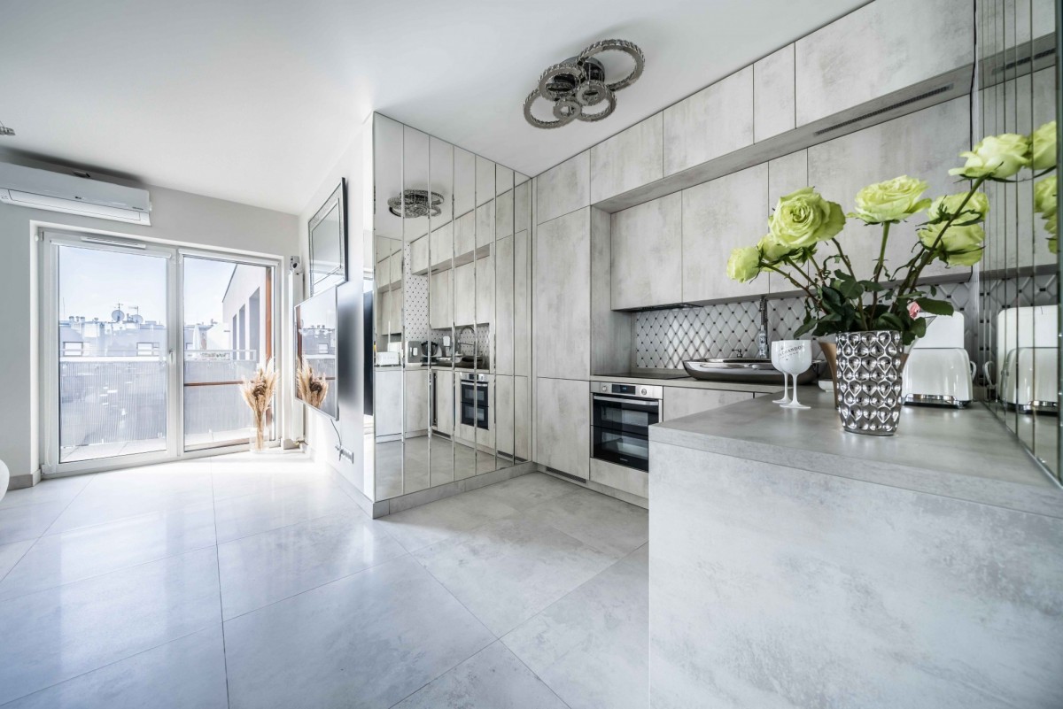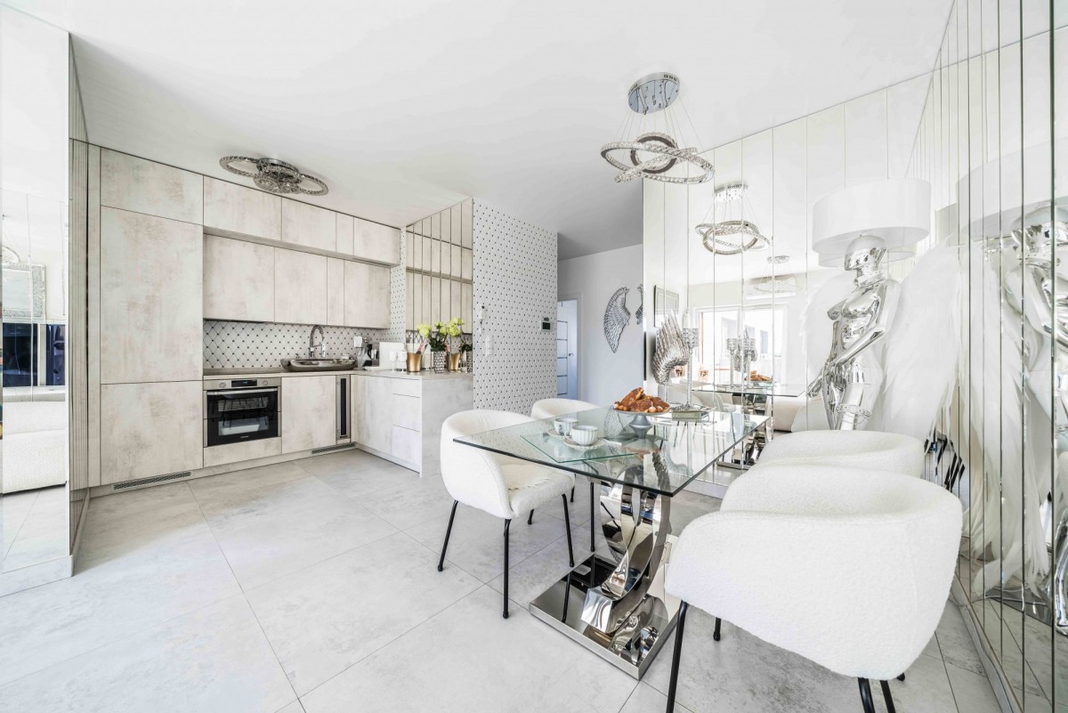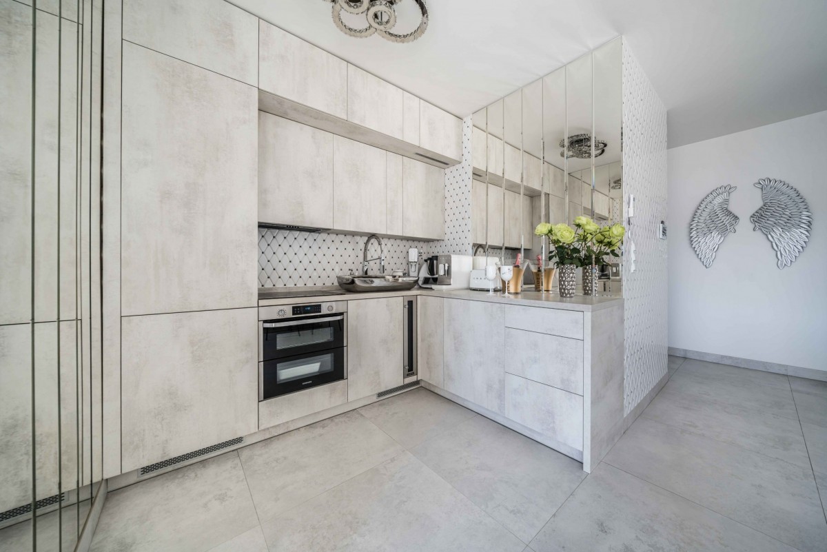 aneks kuchenny z pełnym wyposażeniem w sprzęt AGD marek Samsung i Bosch oraz winiarką (lodówką na wino),