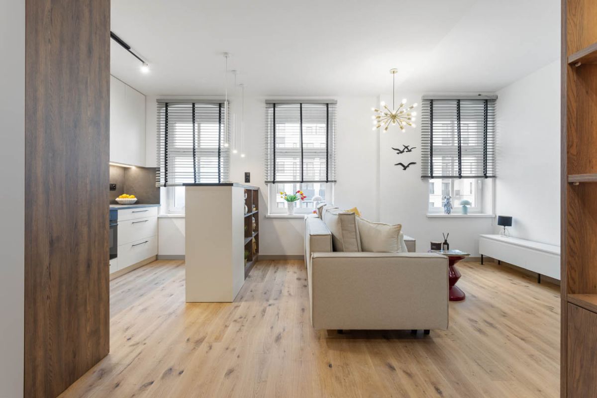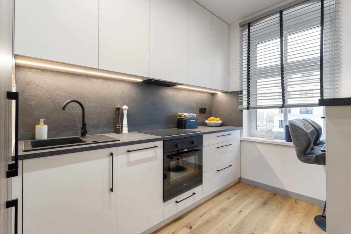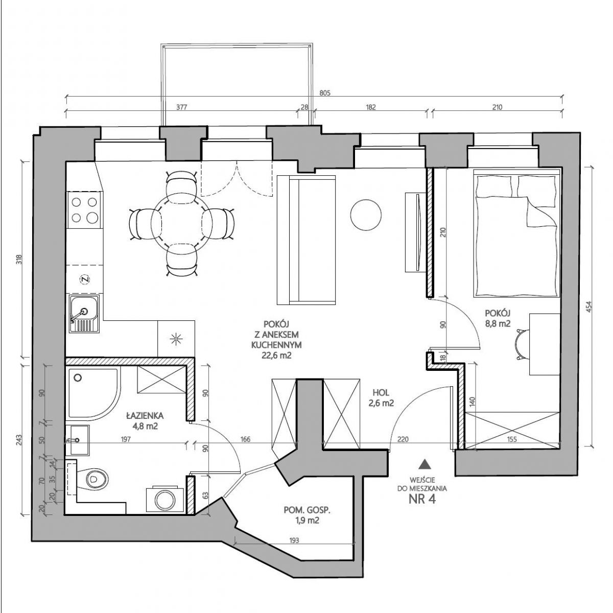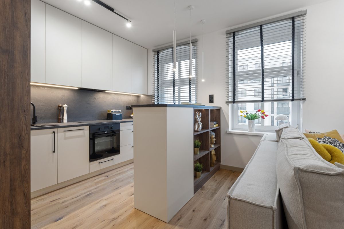 - salonu z aneksem kuchennym i wyjściem na balkon,