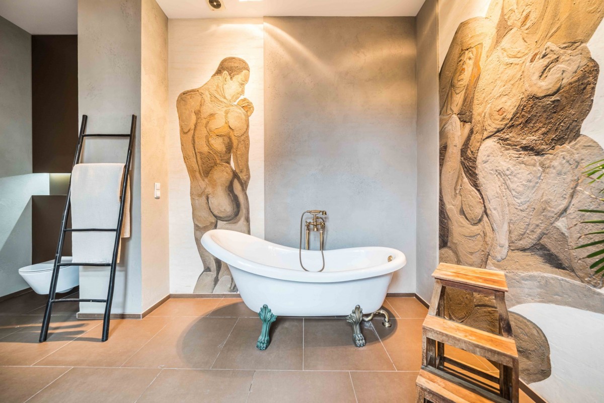 sypialnia z prywatną ogromną łazienką z wanną i balkonem,
