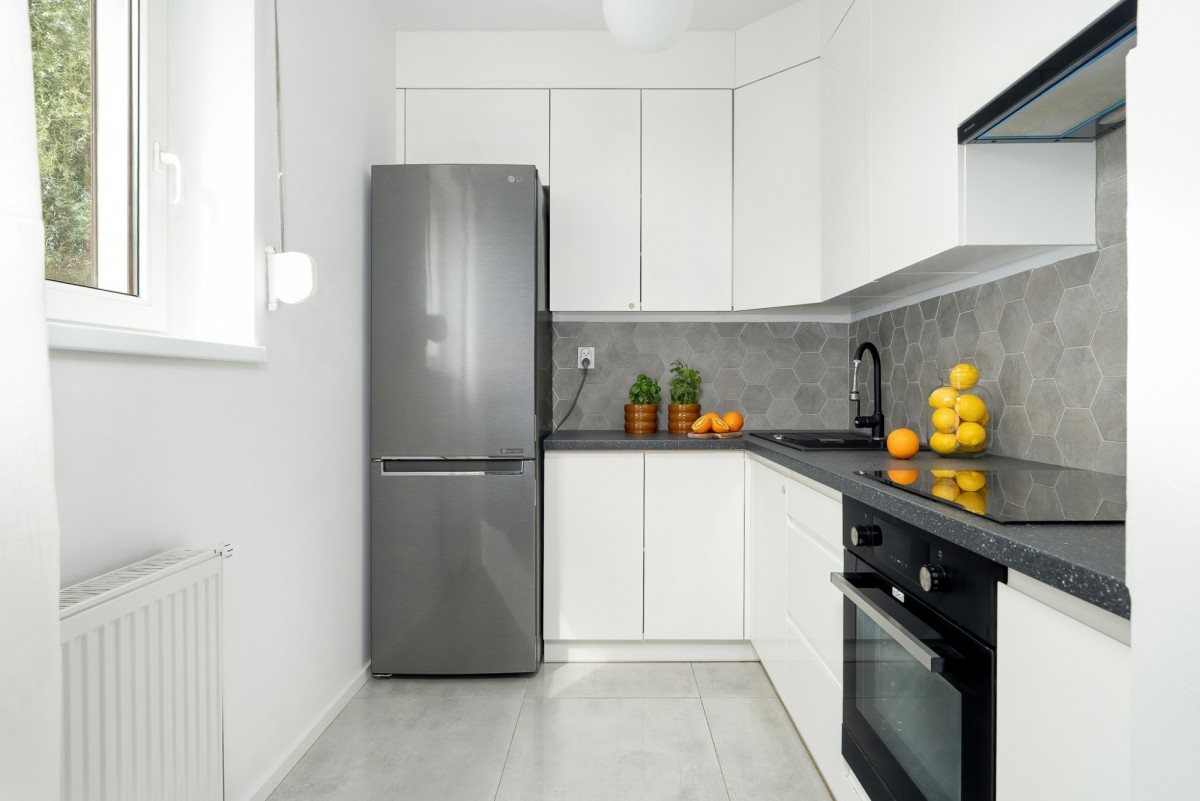Kuchnia w pełni wyposażona jest w sprzęty AGD w zabudowie na wymiar, o przyjemnej kolorystyce.