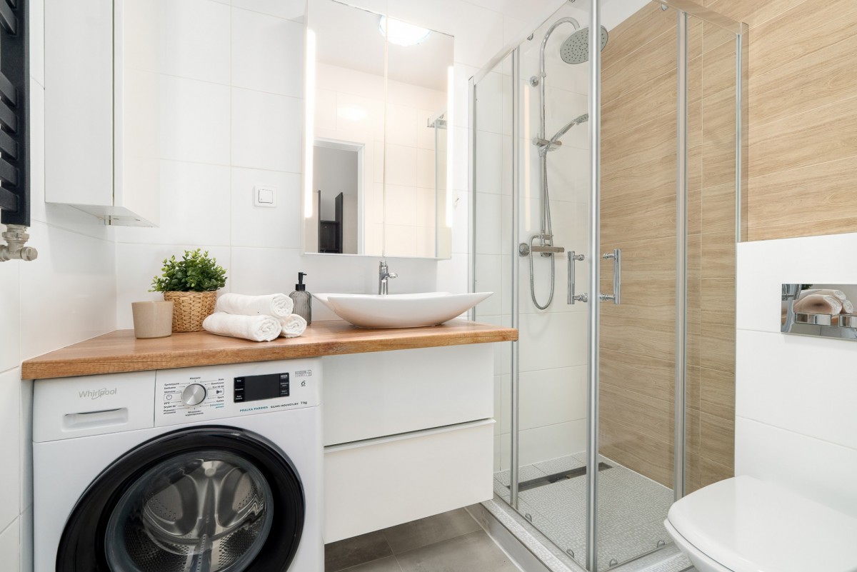 Łazienka wyposażona jest w prysznic, umywalkę i toaletę oraz pralkę, o korzystnej estetyce.