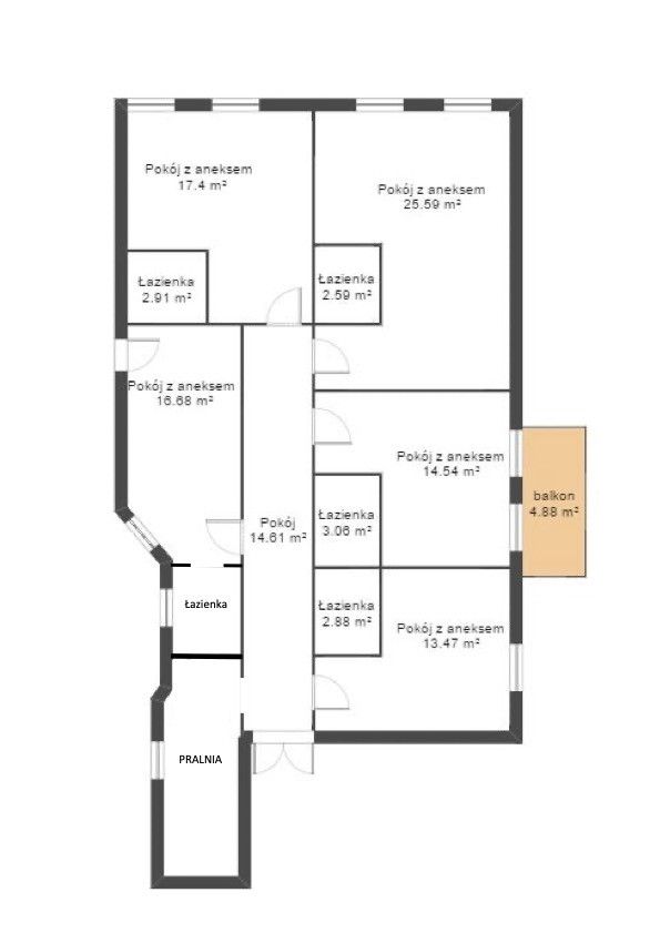 Lokal o łącznej powierzchni 136 m² został podzielony na 5 kompletnie wyposażonych, samodzielnych kawalerek, każda z własną kuchnią i łazienką.