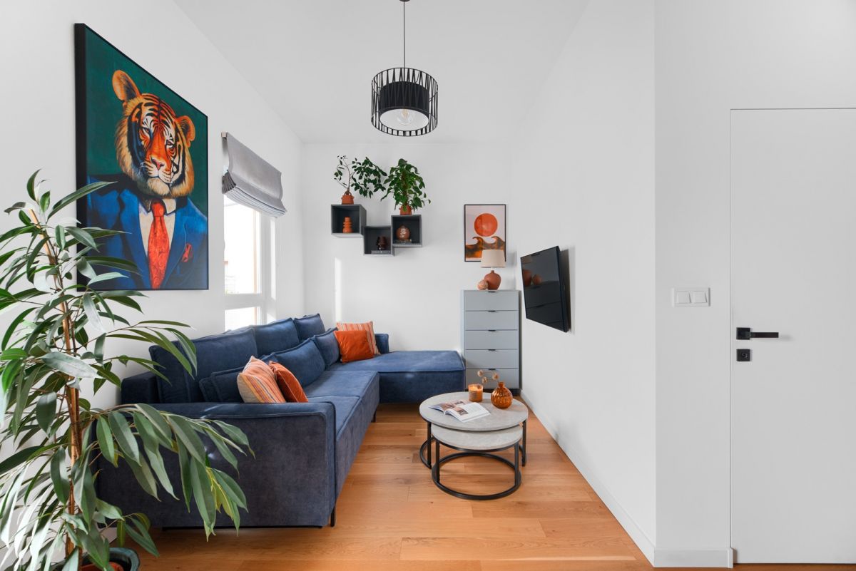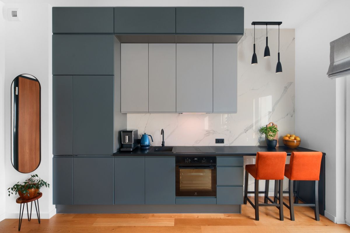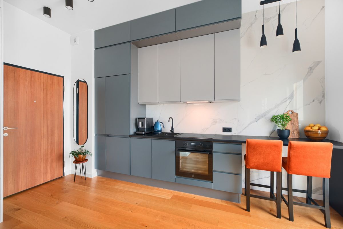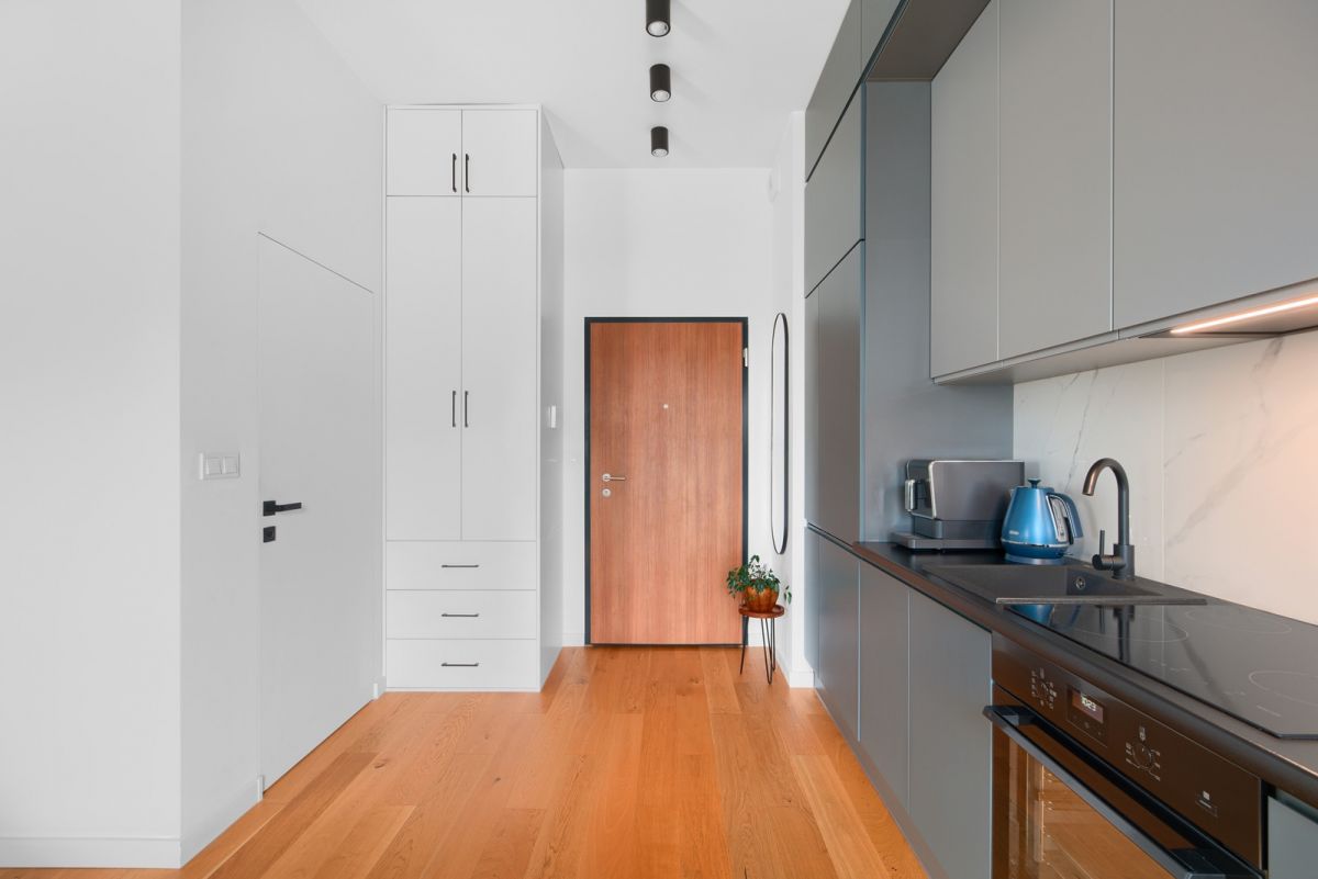 Na podłodze położona jest deska barlinecka. Zabudowa meblowa wykonana została na wymiar.