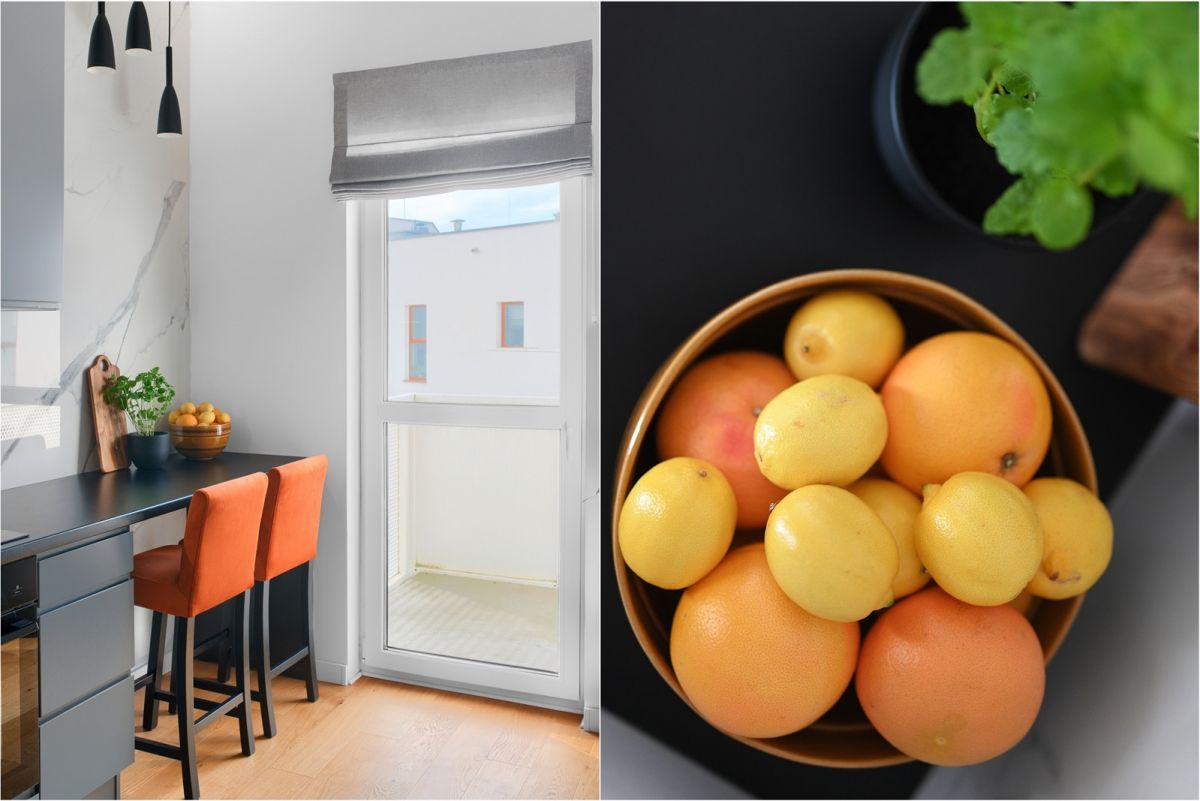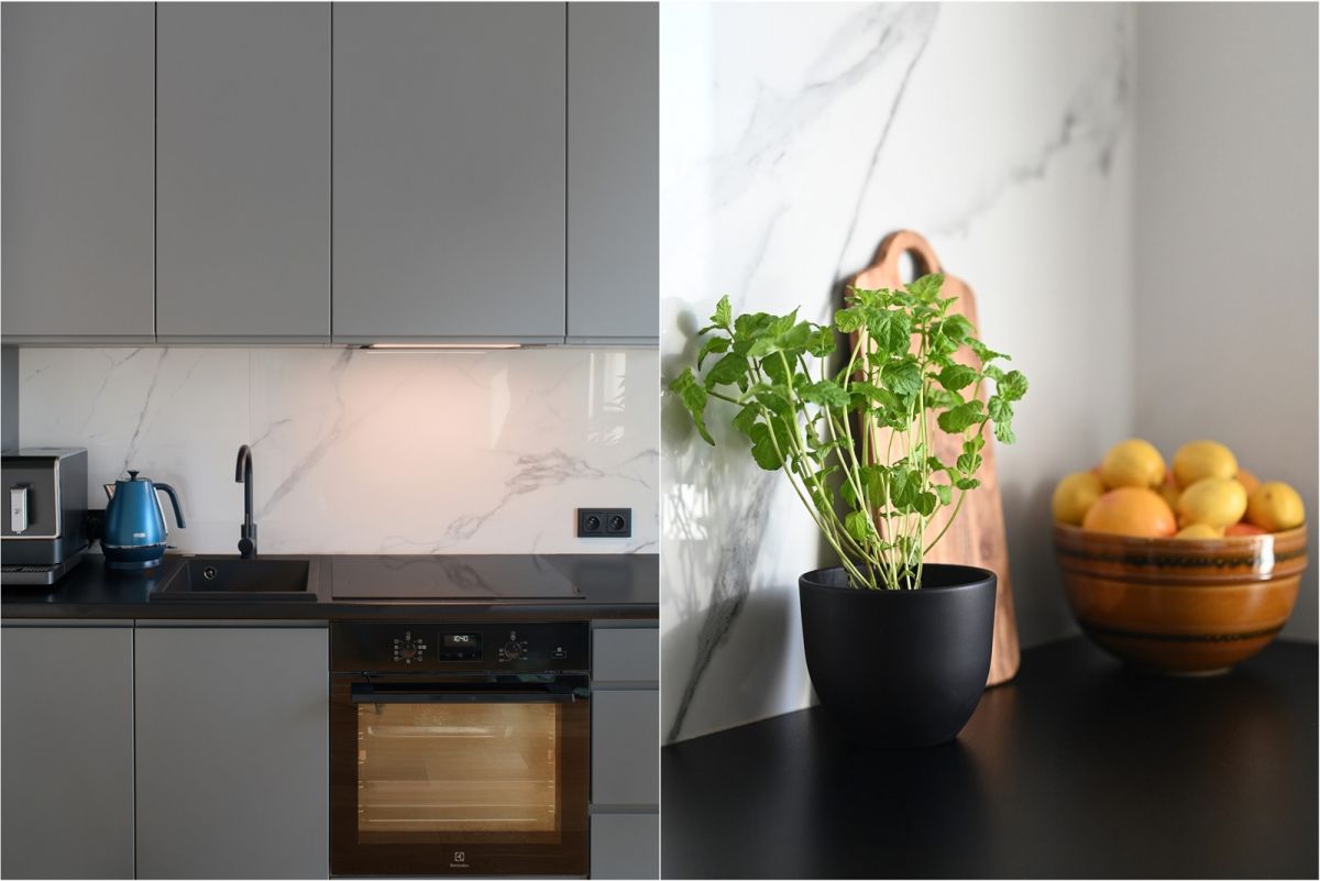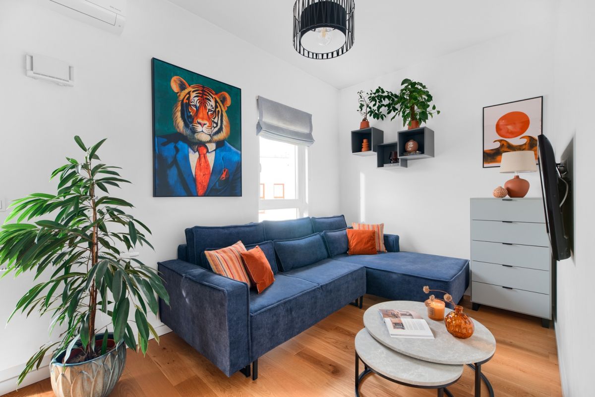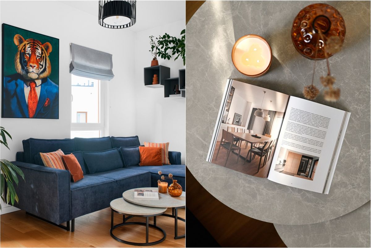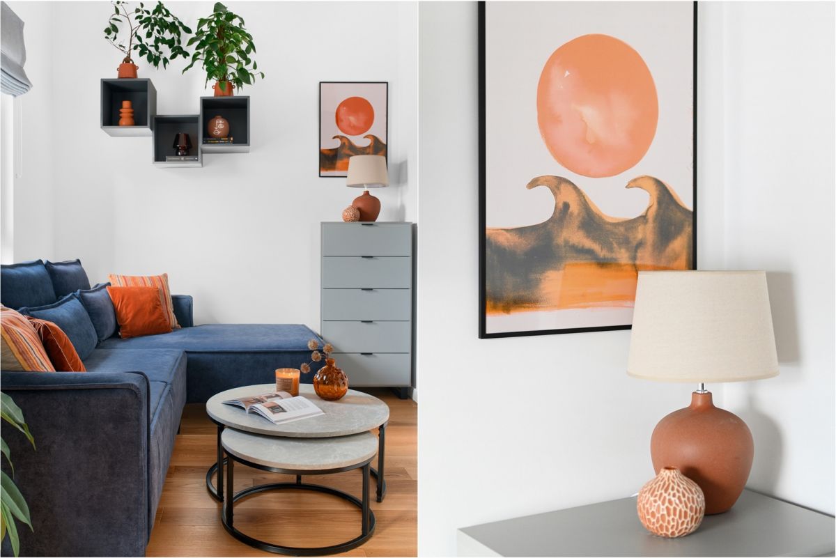 Na podłodze położona jest deska barlinecka. Zabudowa meblowa wykonana została na wymiar.