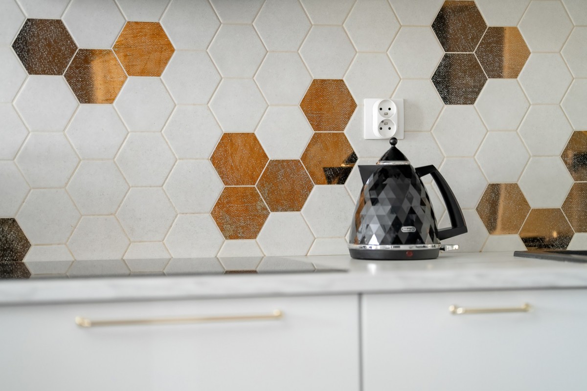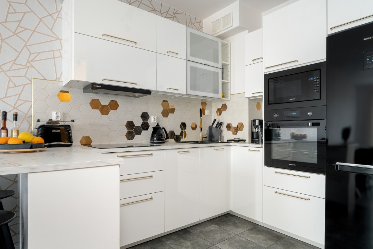 Kuchnia w zabudowie z wysokiej klasy sprzętem Samsung: piekarnik, mikrofala, zmywarka, lodówka, okap