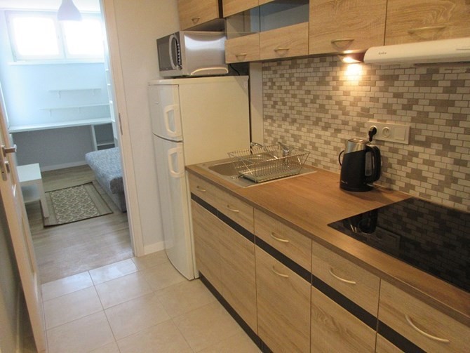 Kuchnia zaaranżowana w formie aneksu w korytarzu.