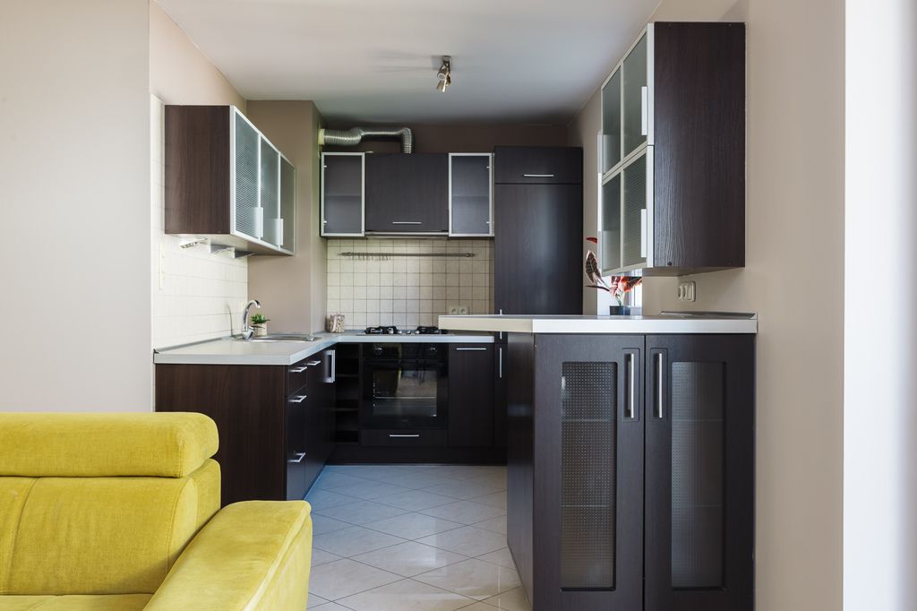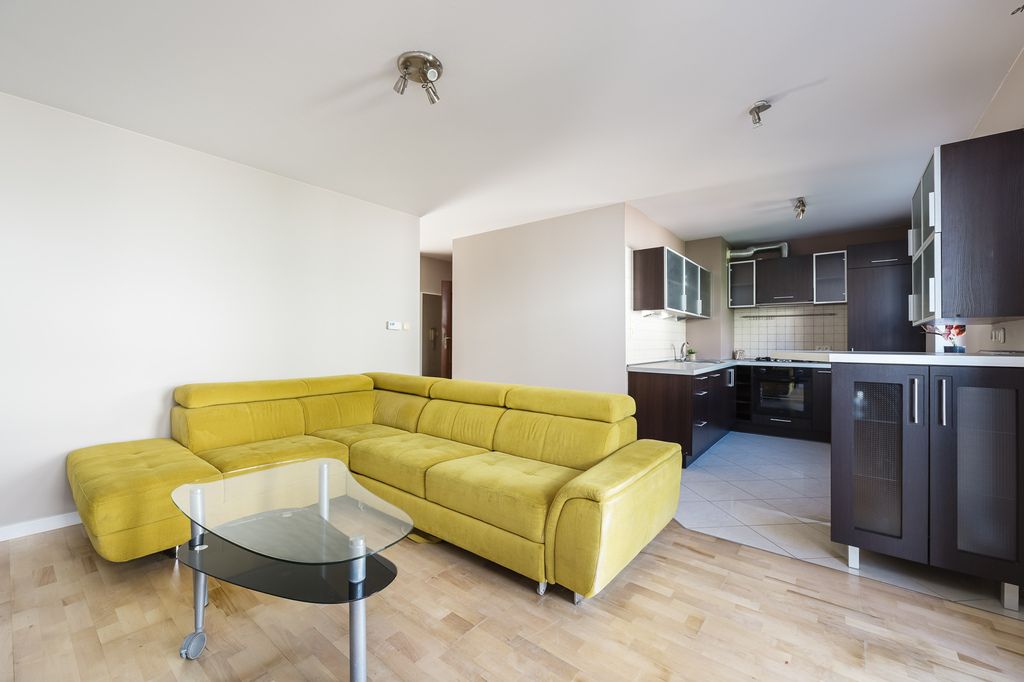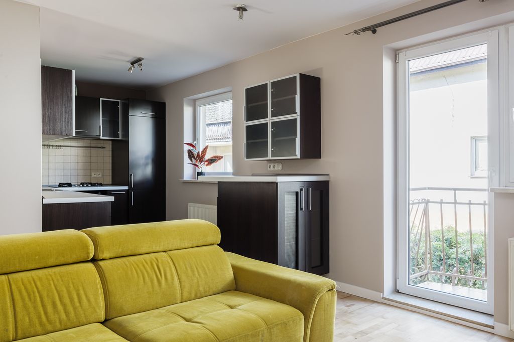 - Salon z wyjściem na balkon i połączoną kuchnią,