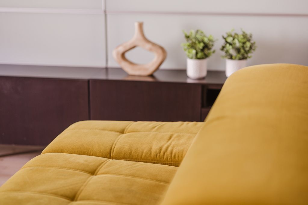 Kuchnia z oknem, sprytnie schowana we wnęce, a jednocześnie połączona z salonem, tworzy przestrzeń, która jest i otwarta, i funkcjonalnie podzielona.