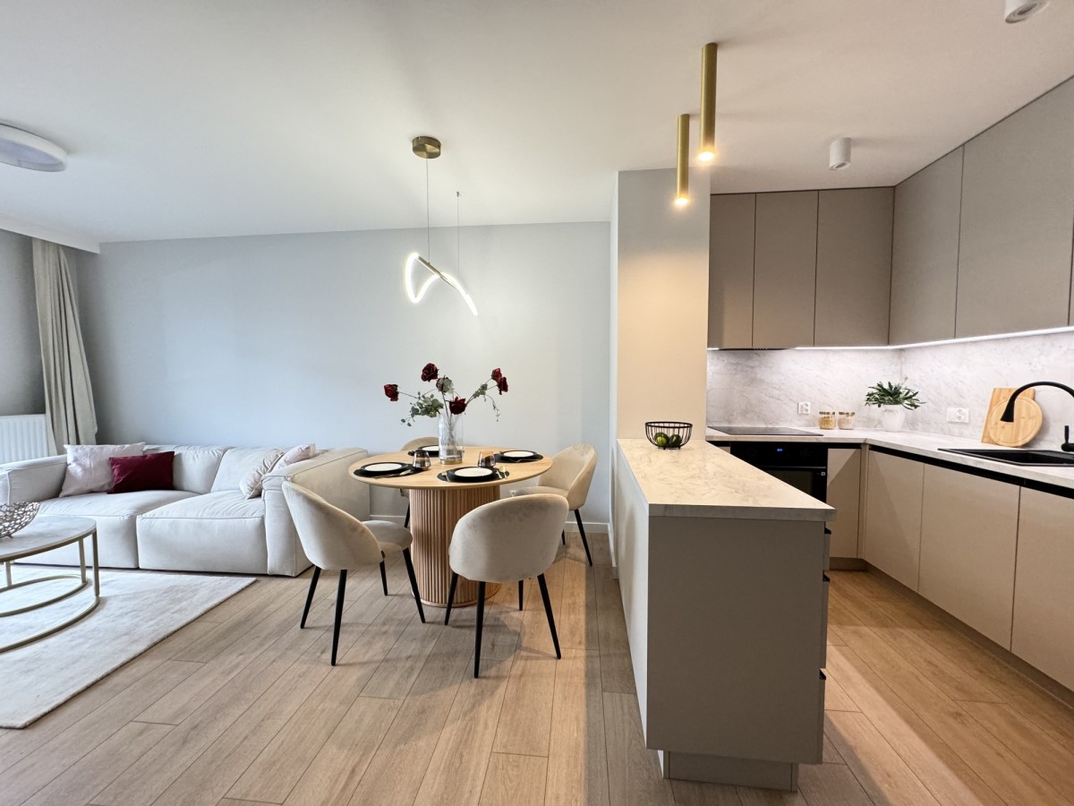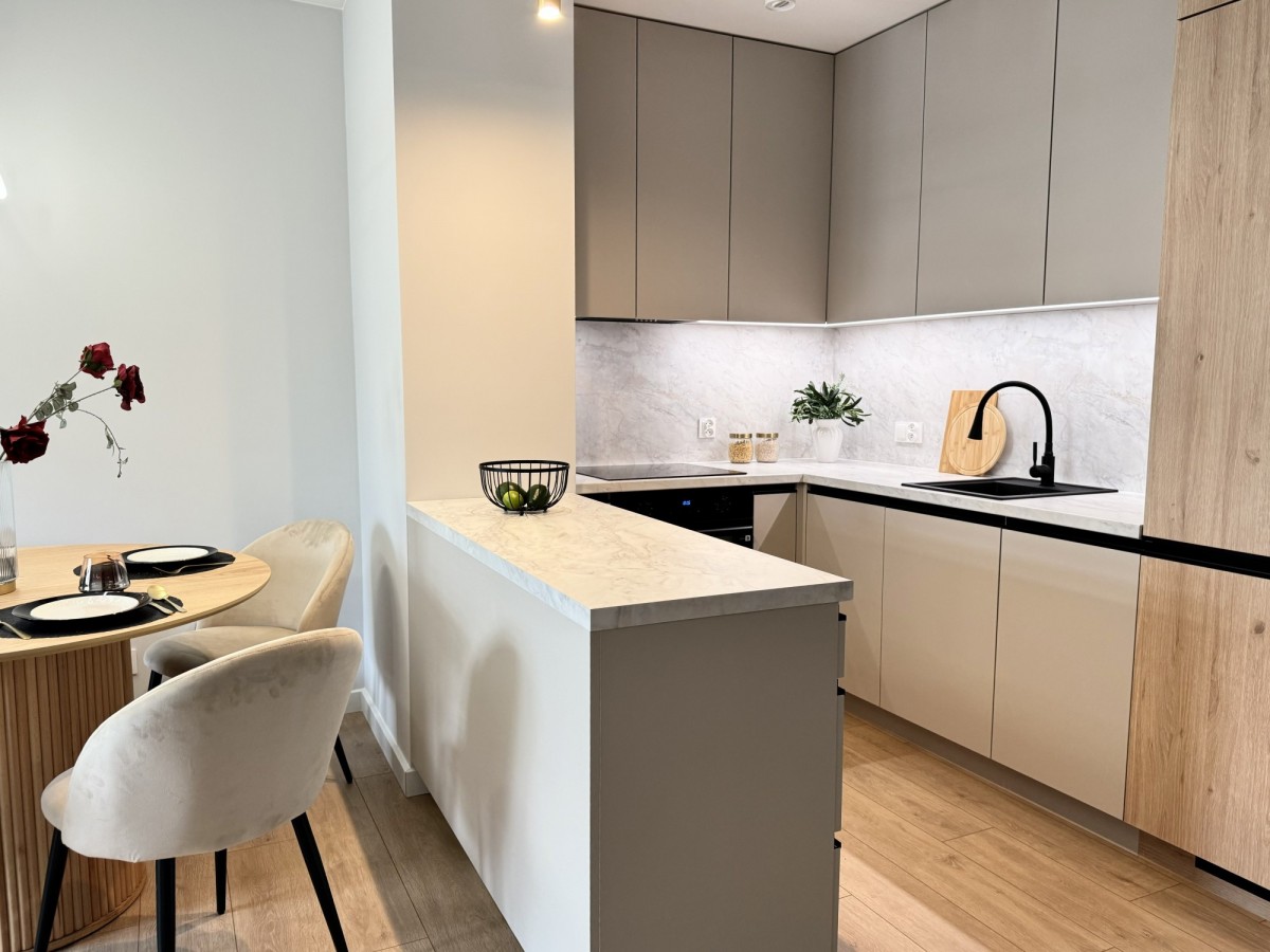 - W aneksie kuchennym: zabudowa kuchenna: szafki górne do samego sufitu, podświetlane i dolne. Sprzęt AGD w zabudowie: pochłaniacz, płyta indukcyjna, piekarnik.