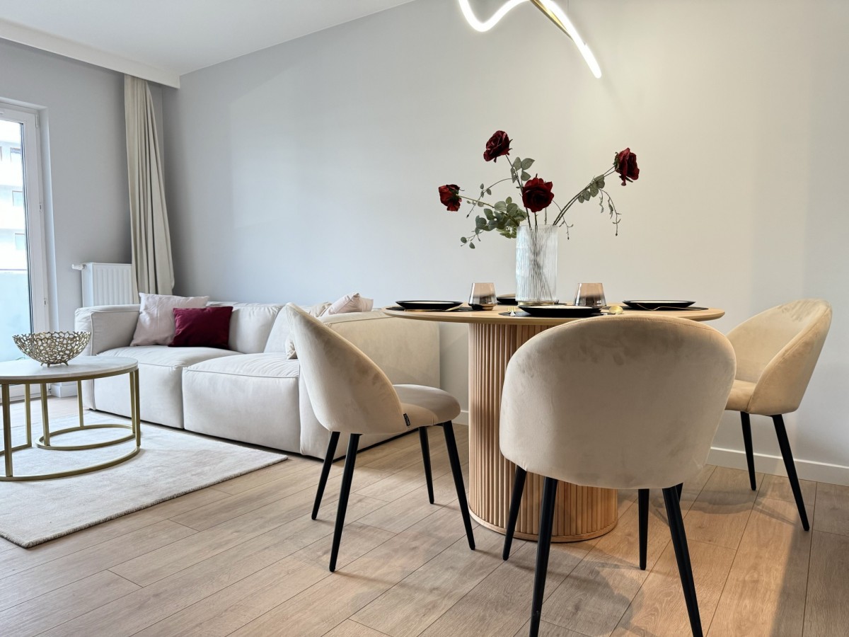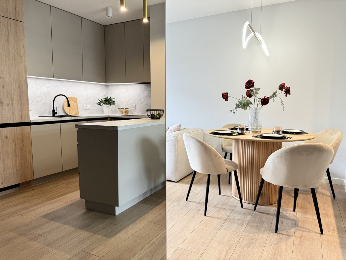 Mieszkanie zostało zaprojektowane przez architekta, materiały użyte do jego wykończenia są najwyższej jakości: na podłogach w pokojach panele o wysokim stopniu ścieralności, w korytarzu i w łazience wysokogatunkowe płytki. Wszystko tu kolorystycznie spójne i wykonane z najwyższą precyzją. Mieszkanie bardzo słoneczne. W salonie wielkie panoramiczne okno i przeszklone drzwi prowadzące do ogrodu powodują, że do mieszkania wpada bardzo dużo światła. Ogrzewanie miejskie. Mieszkanie jest w chwili obecnej wykańczane według załączonych wizualizacji.