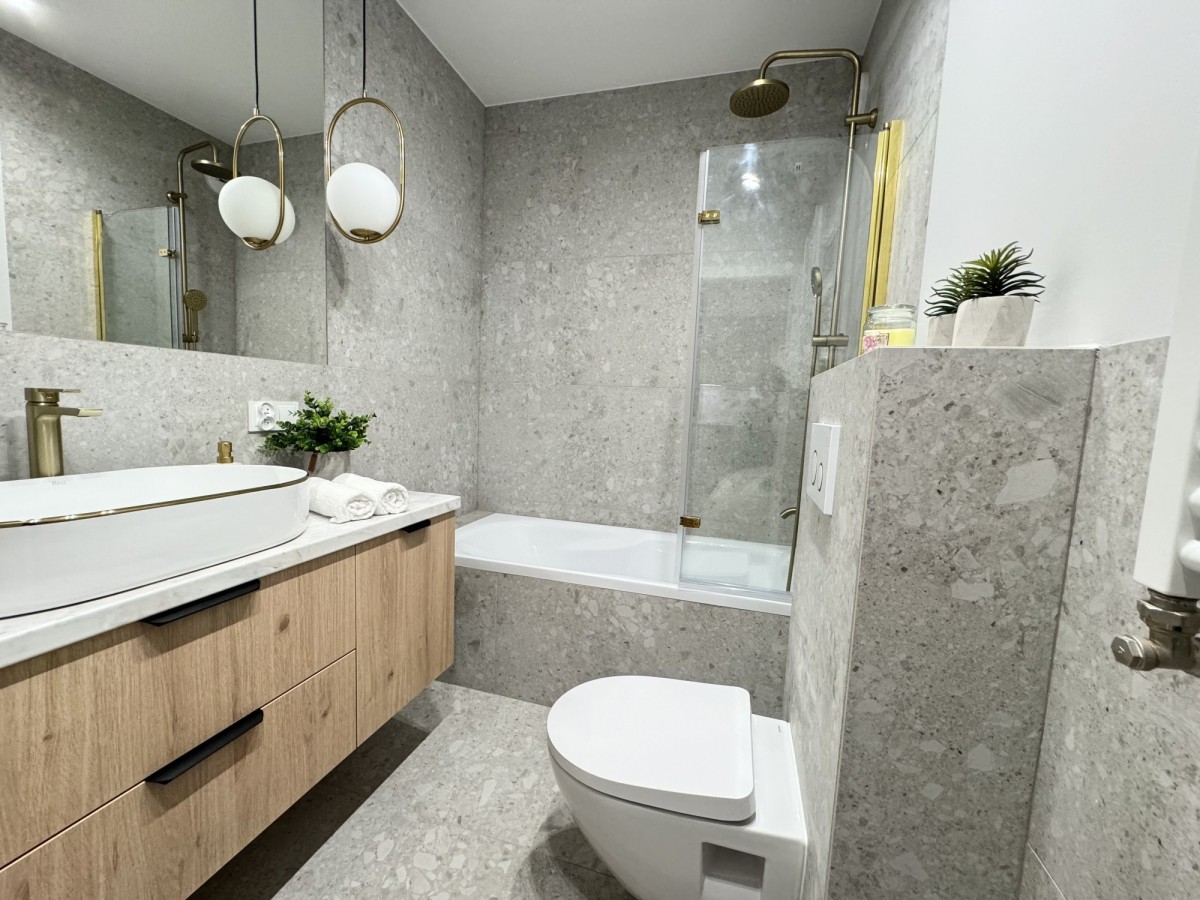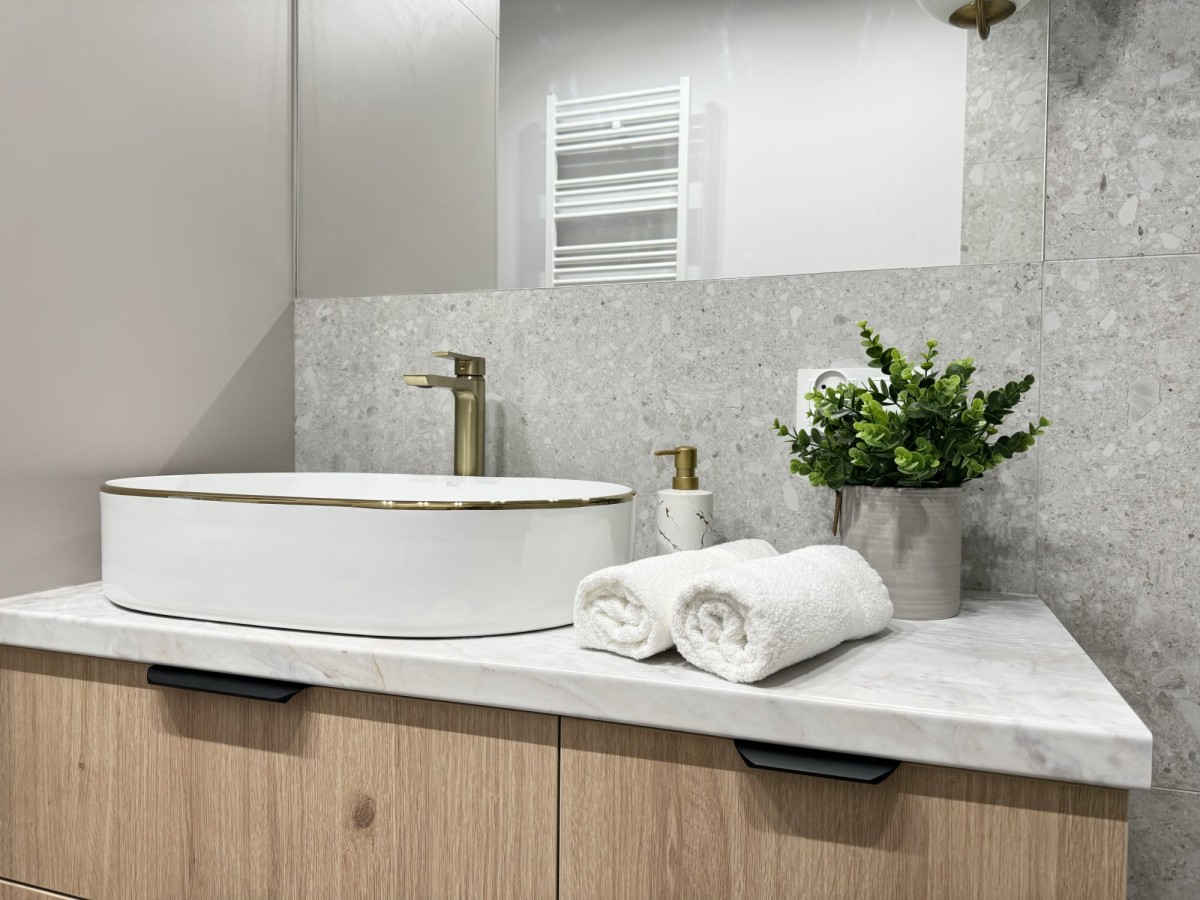 - W łazience - na podłodze i ścianach położono wysokogatunkowe płytki, wanna z deszczownicą, baterią prysznicową i szklanym parawanem, WC geberit, umywalka osadzona na szafce z szufladmi, zabudowa z miejscem na pralkę i suszarkę. Zainstalowano oświetlenie dzienne i nocne.