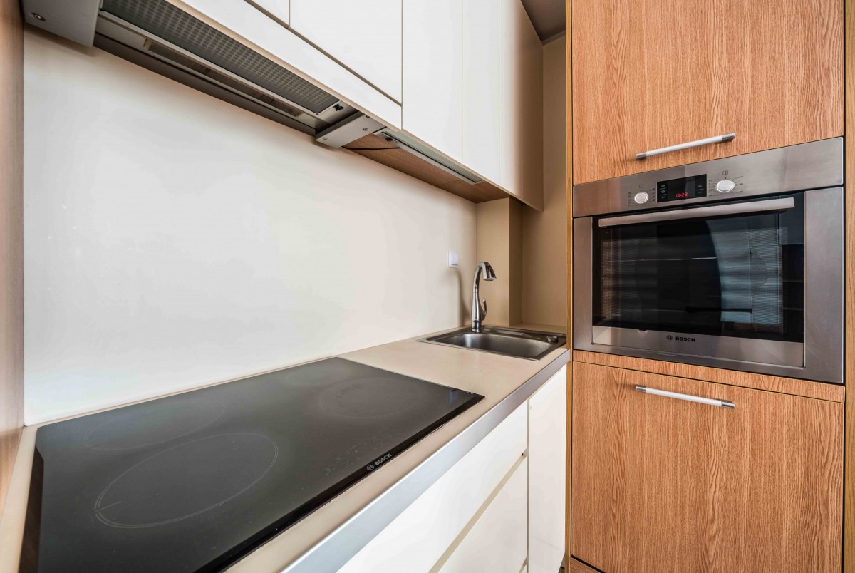 Nowoczesna kuchnia w zabudowie - w pełni wyposażona w sprzęt AGD, z funkcjonalnymi rozwiązaniami,