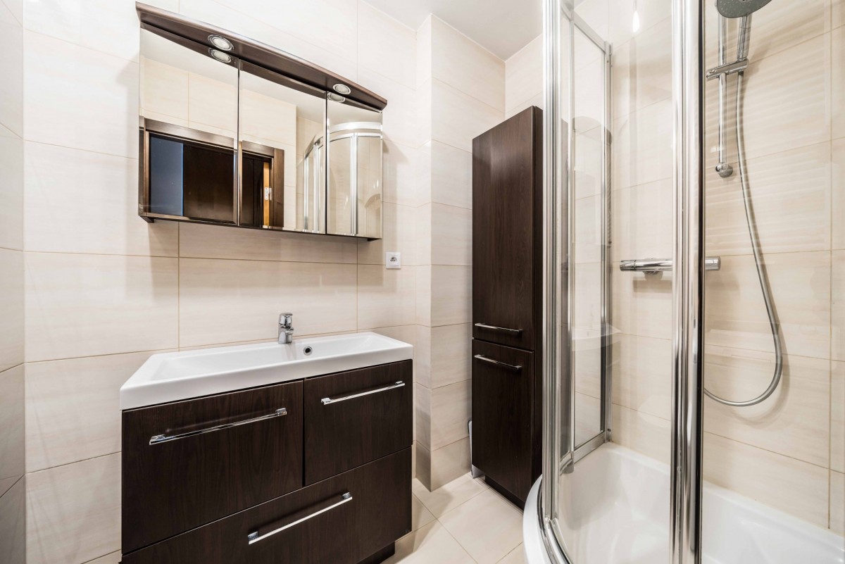 Stylowa łazienka z prysznicem i zabudową meblową,