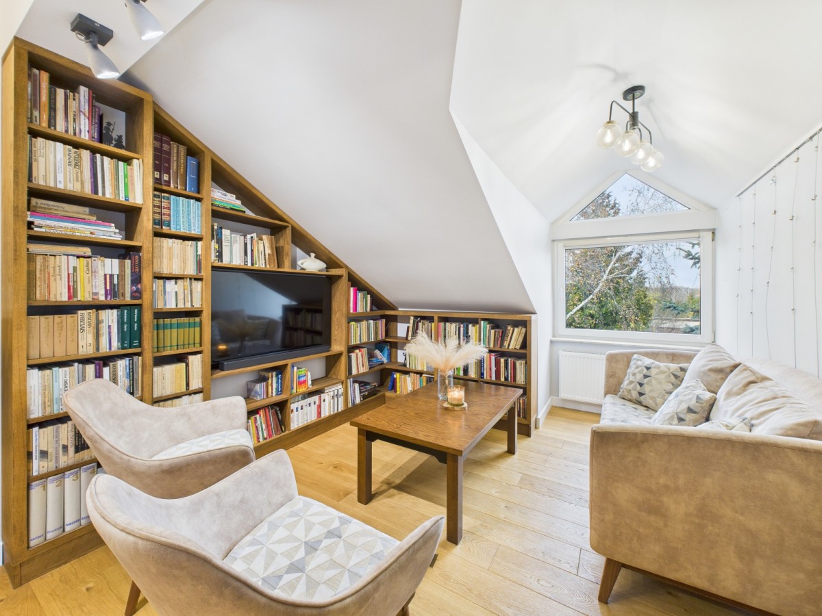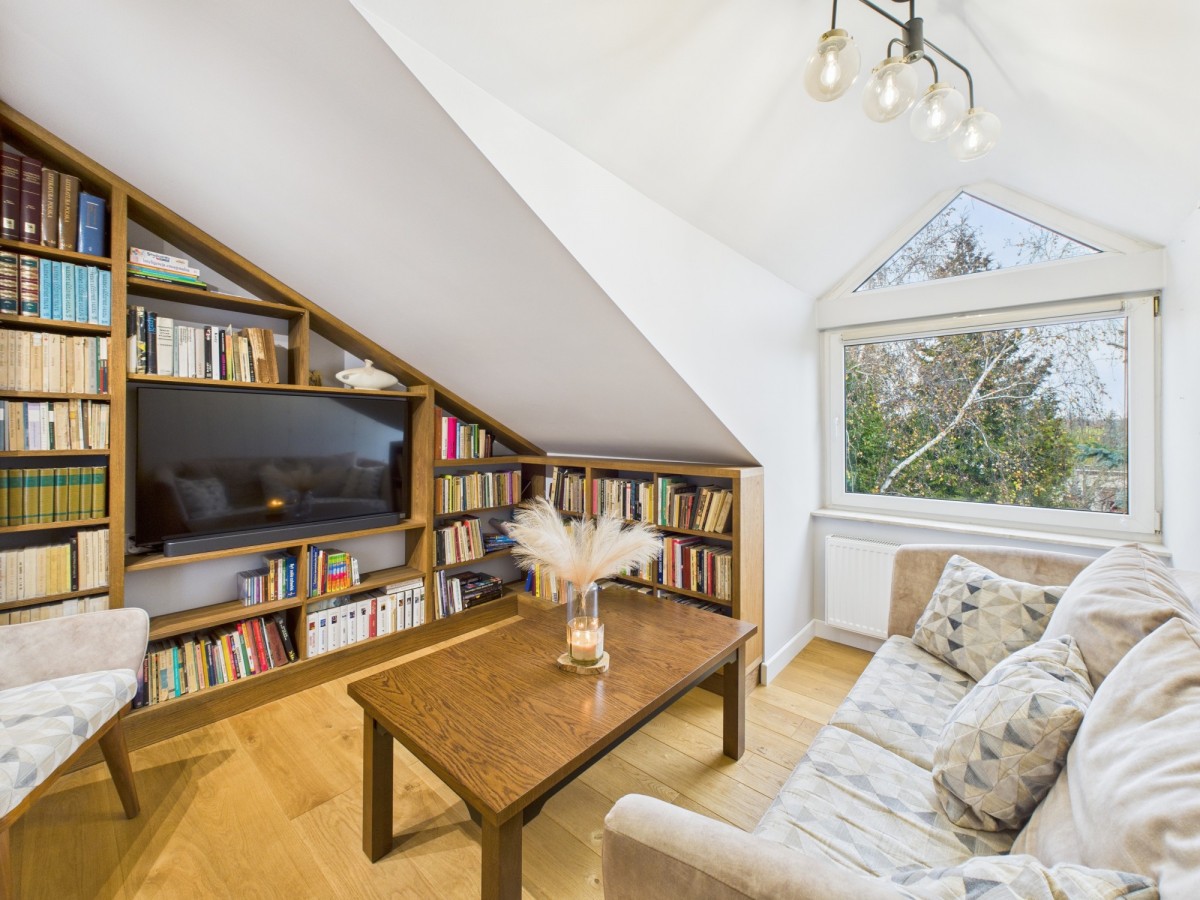 Salon - przytulna przestrzeń z kącikiem TV, zabudową na książki oraz wyjściem na taras,