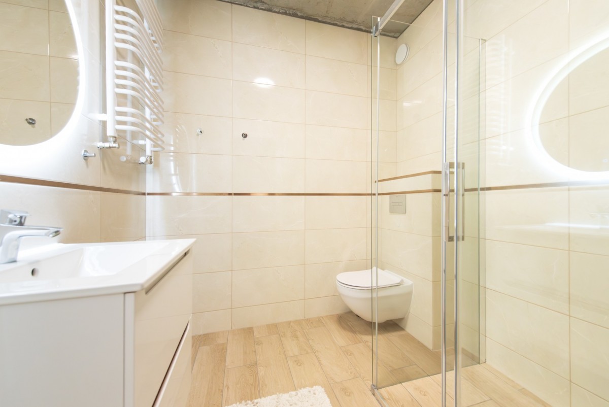 • łazienka - 4,08 m², dostępna bezpośrednio z korytarza, wykończona w jasnych, ciepłych kolorach