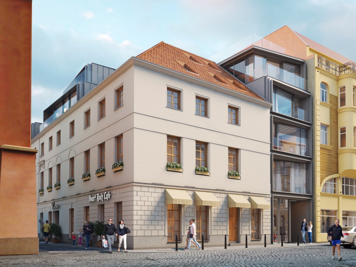 Projekt obejmuje odnowienie historycznej kamienicy oraz nowoczesną jej rozbudowę, dopasowaną skalą i formą do charakteru tego miejsca.
