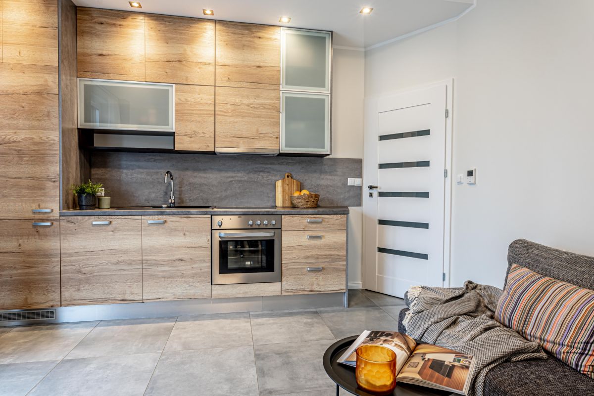 Kuchnia wyposażona jest w sprzęty AGD: lodówka, zmywarka 60 cm, piekarnik i płyta grzewcza.