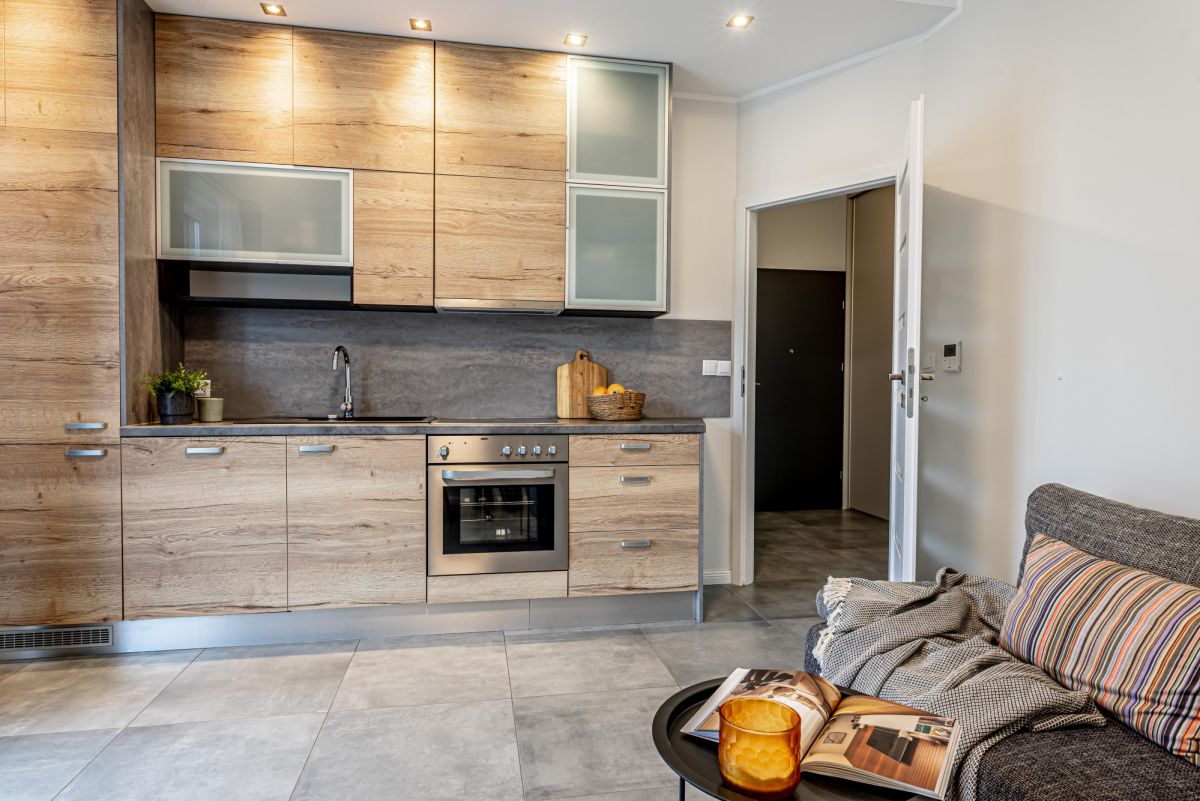 Kuchnia wyposażona jest w sprzęty AGD: lodówka, zmywarka 60 cm, piekarnik i płyta grzewcza.