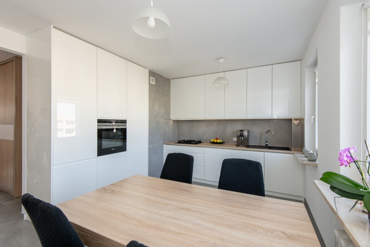 Kuchnia w zabudowie (w szufladach, szafkach zastosowano niezawodne okucia blum) wraz ze sprzętem AGD (lodówka, zmywarka, piekarnik, pralka, kuchenka gazowa).
