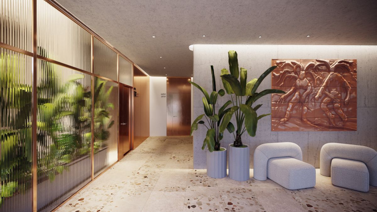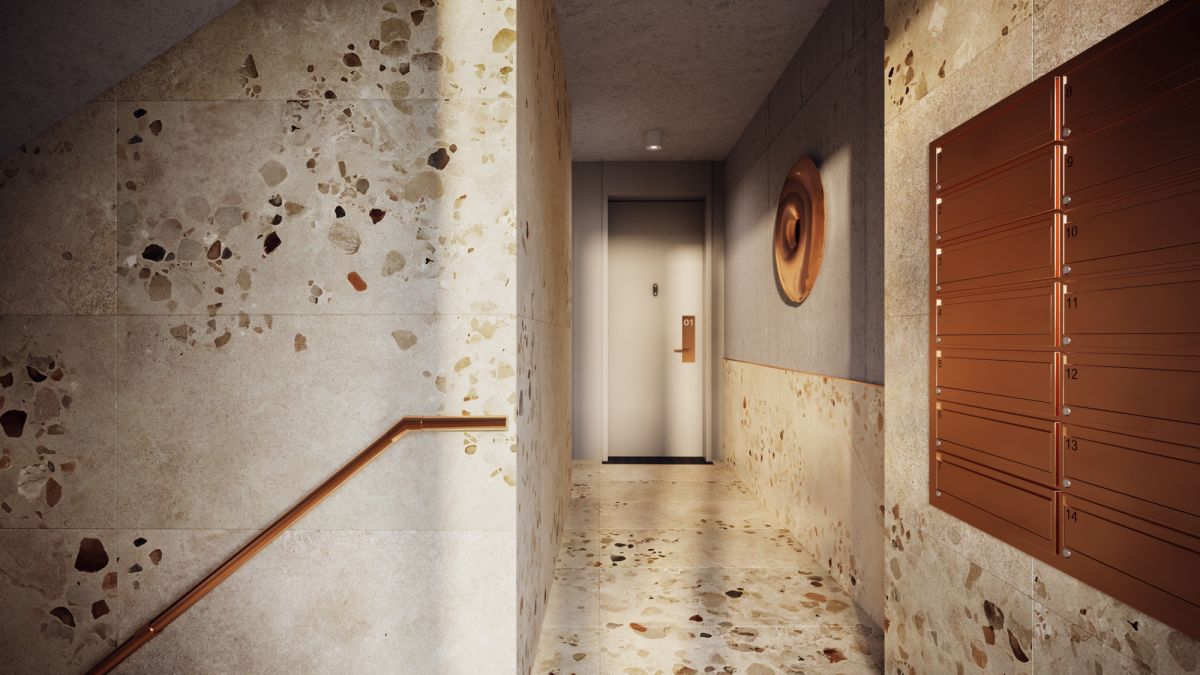 Części wspólne zaprojektowane zostały przez studio Modelina z dbałością o każdy detal - naturalne materiały (drewno, kamień, szkliwo) i stonowana paleta barw podkreślają luksusowy charakter inwestycji. Dodatkowo przestrzenie wspólne zostały wzbogacone o sztukę - w lobby mieszkańców wita autorska płaskorzeźba ceramiczna Alicji Białej, co nadaje całemu budynkowi wyjątkowy, artystyczny klimat.