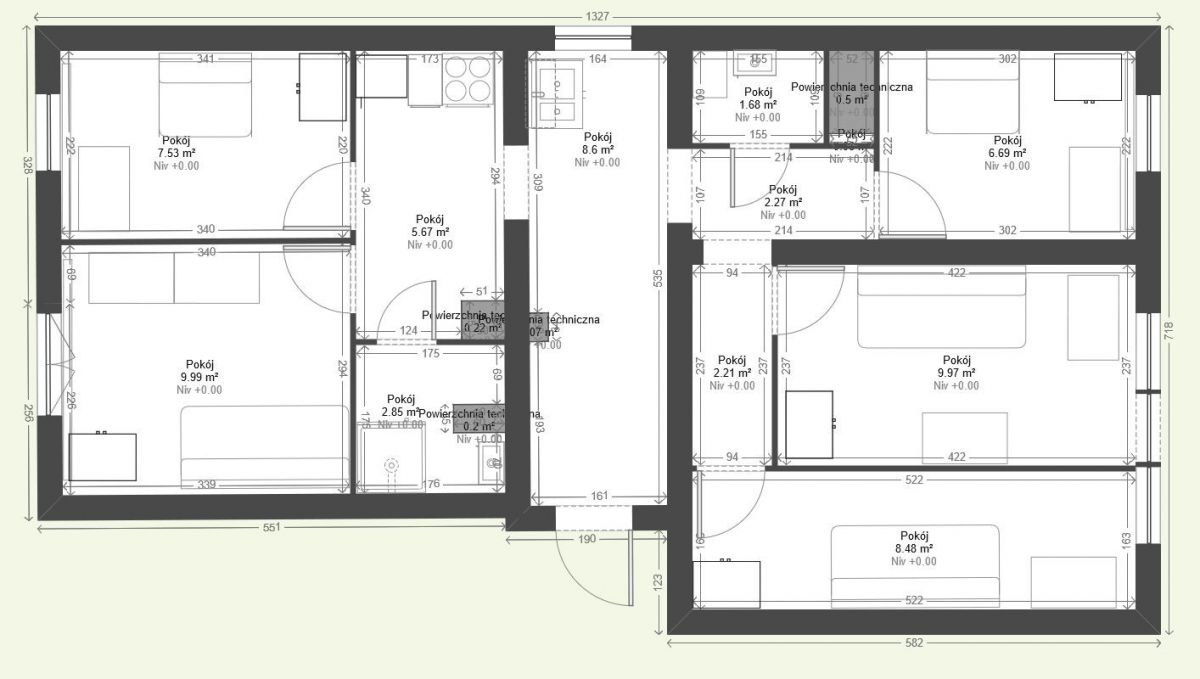 - Pokój 1: 10 m²
