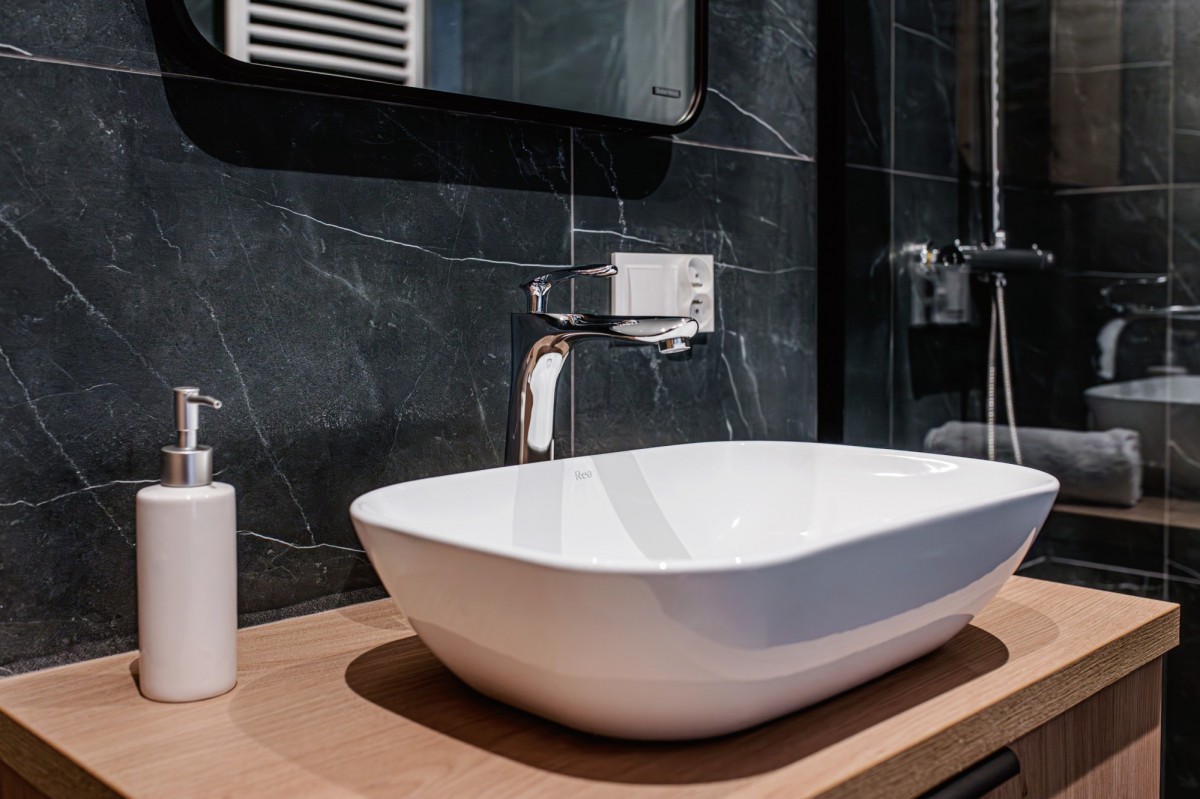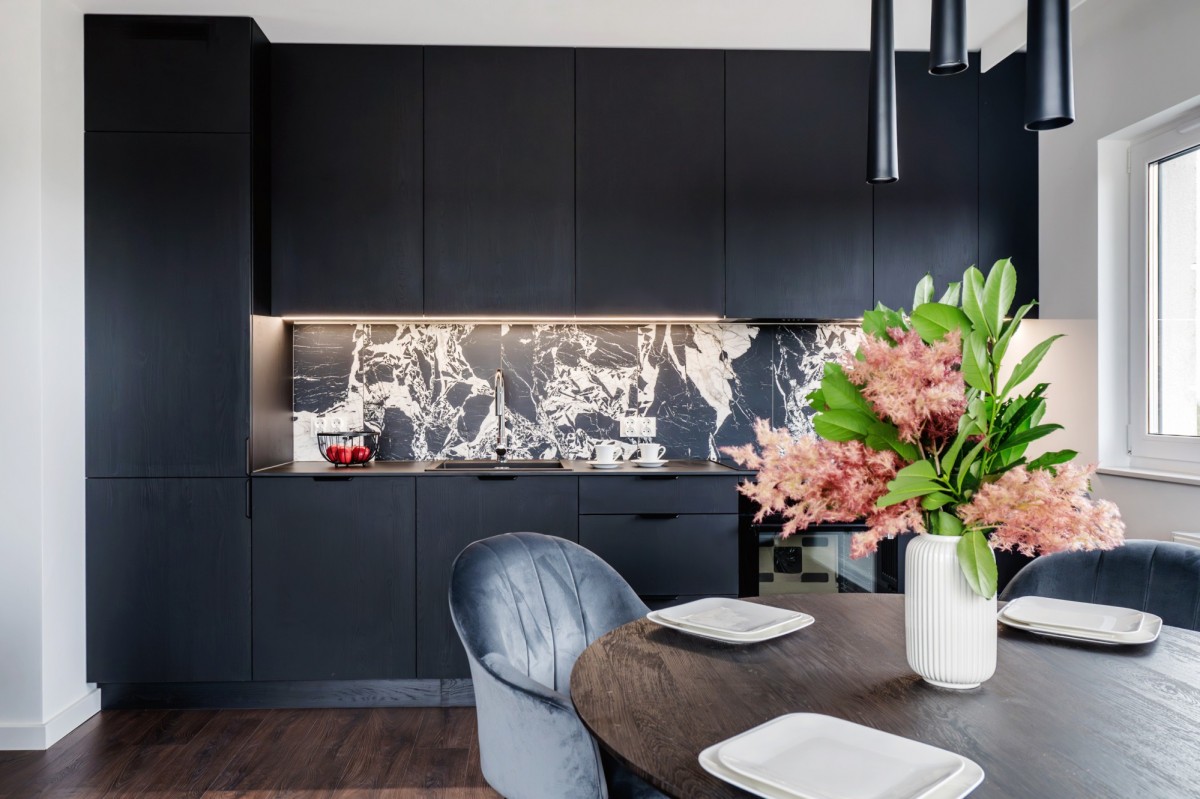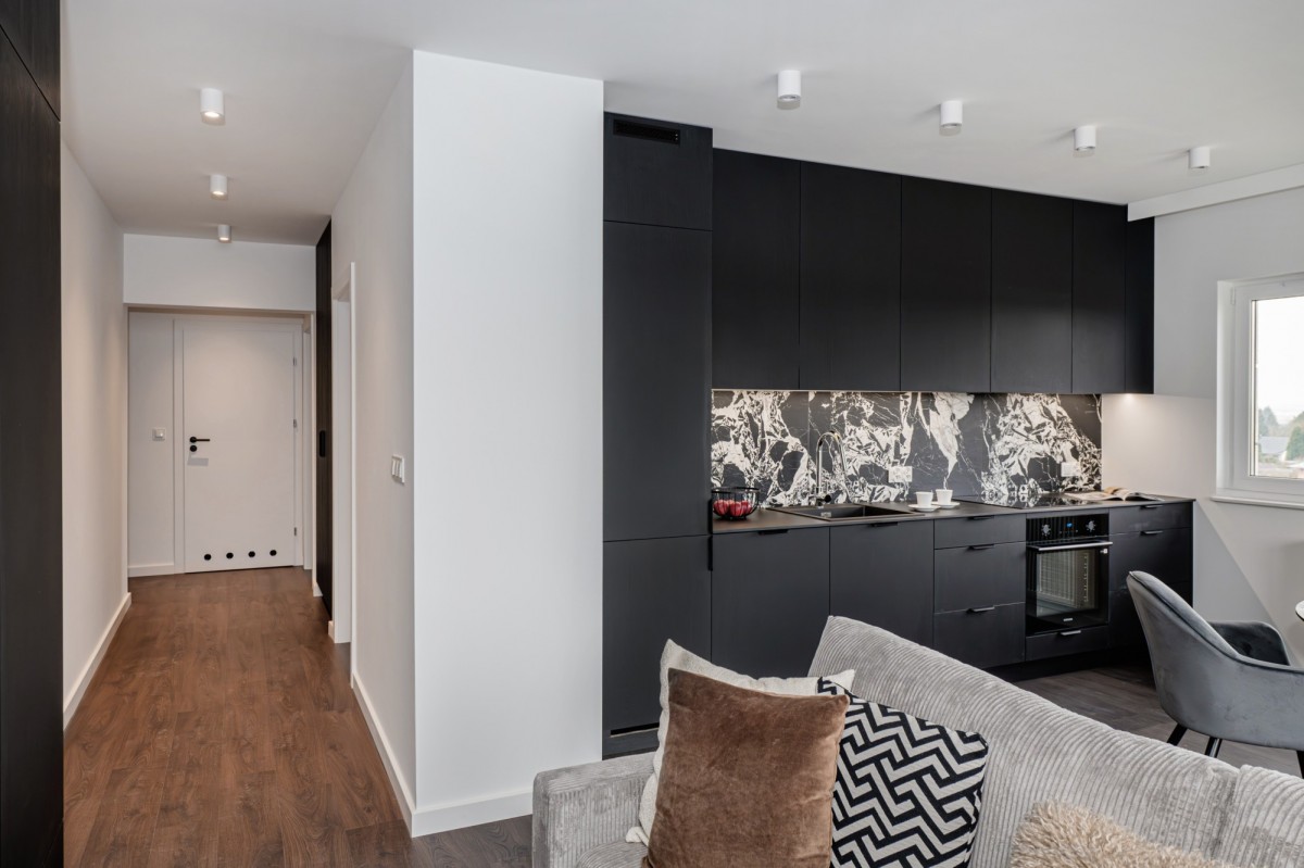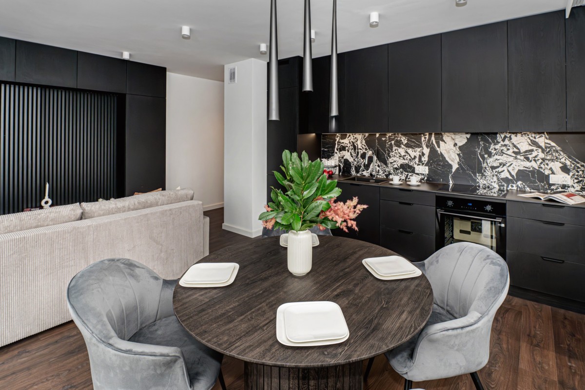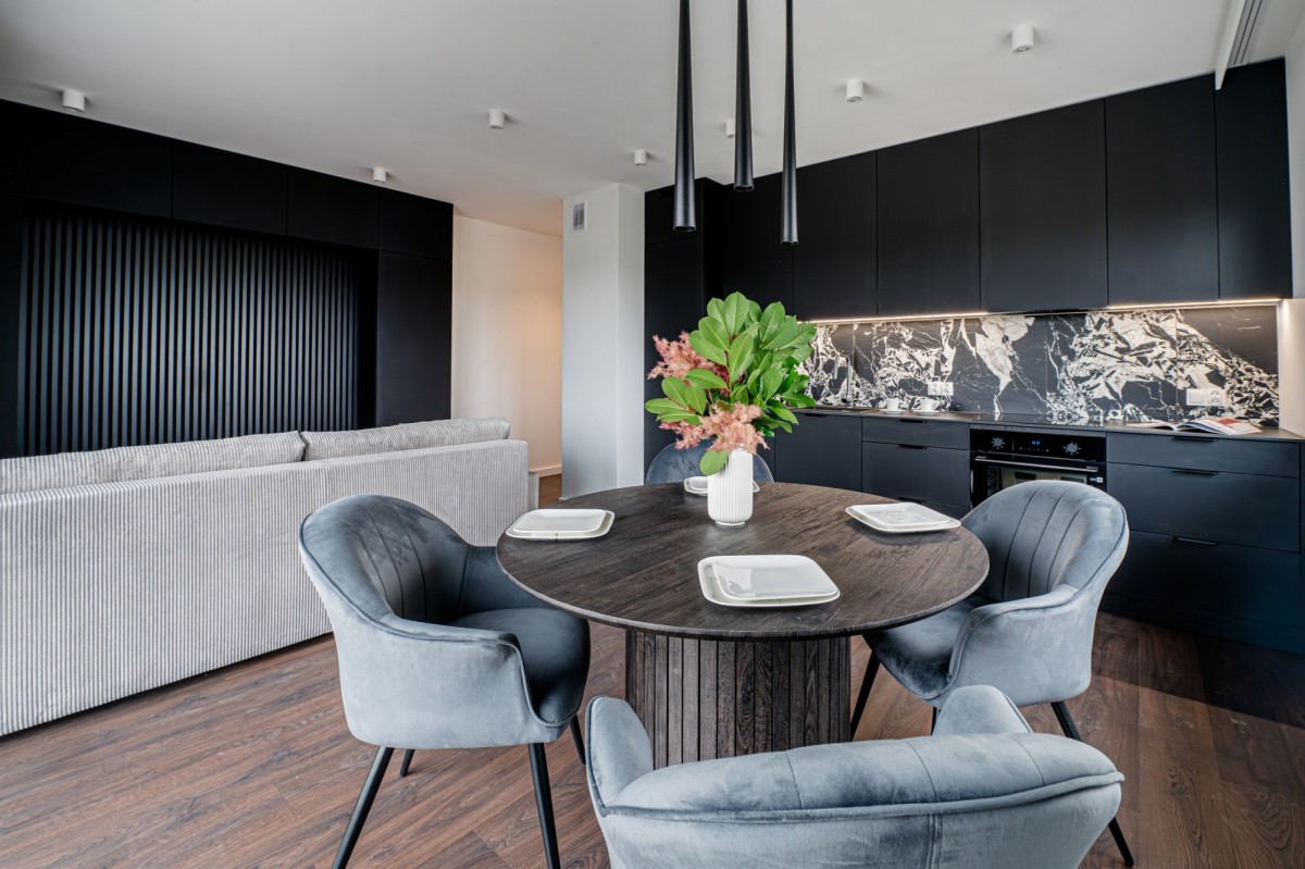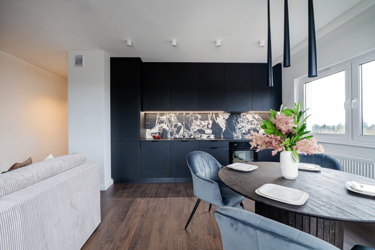 Mieszkanie jest wykończone z największą precyzją w kolorach czerni, drewna i bieli, z dużą ilością naturalnego światła.