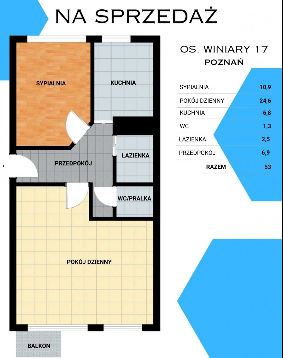 Mieszkanie 2 pokojowe, o powierzchni 53m2. Na całkowity metraż skadają sie: