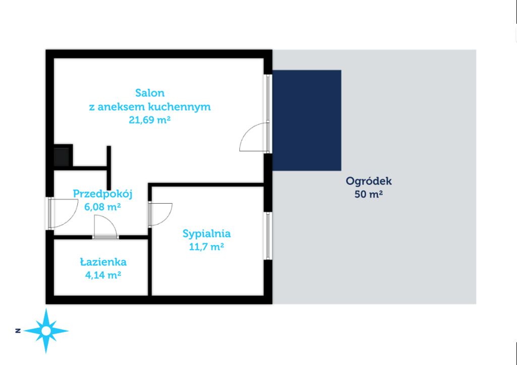 Lokal o powierzchni użytkowej 43,61 m2, znajduje się na parterze i składa się z: