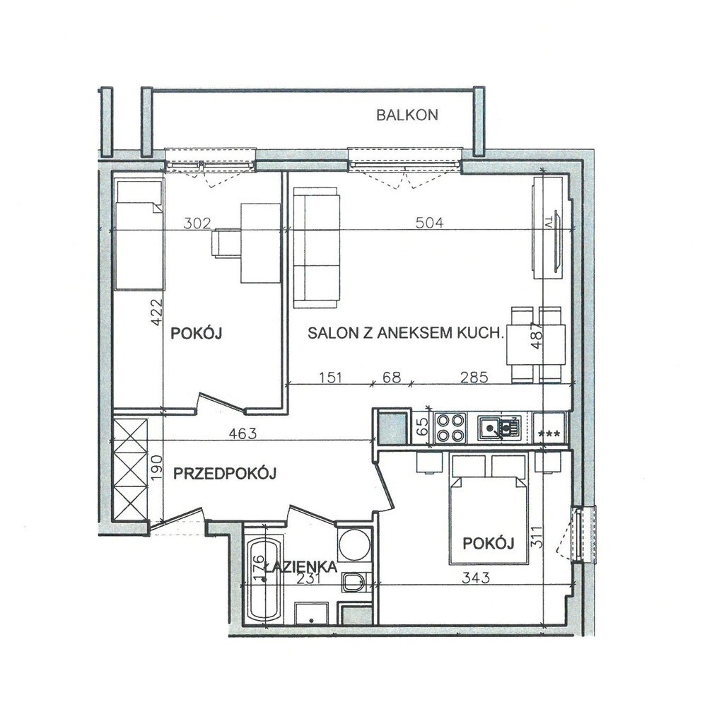 - pokój z aneksem kuchennym 24,54 m2, z wyjściem na balkon typu loggia 6,28 m2 od strony zachodniej,