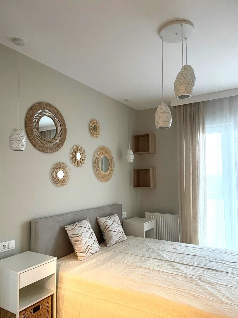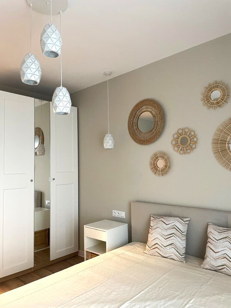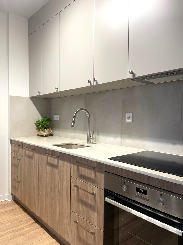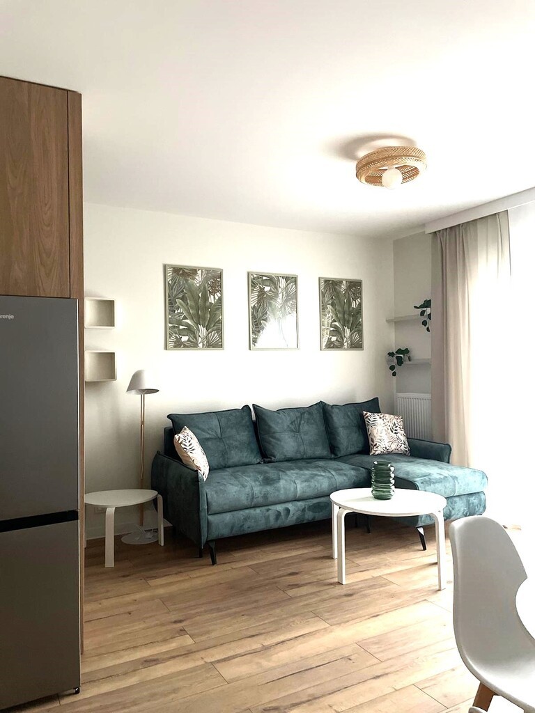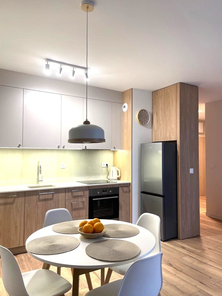 Na podłogach w pokojach i przedpokoju panele. Okna PCV. Aneks kuchenny zabudowany na wymiar, kompletnie wyposażony w sprzęt AGD (lodówka, zmywarka, płyta indukcyjna, piekarnik), blat granitowy.