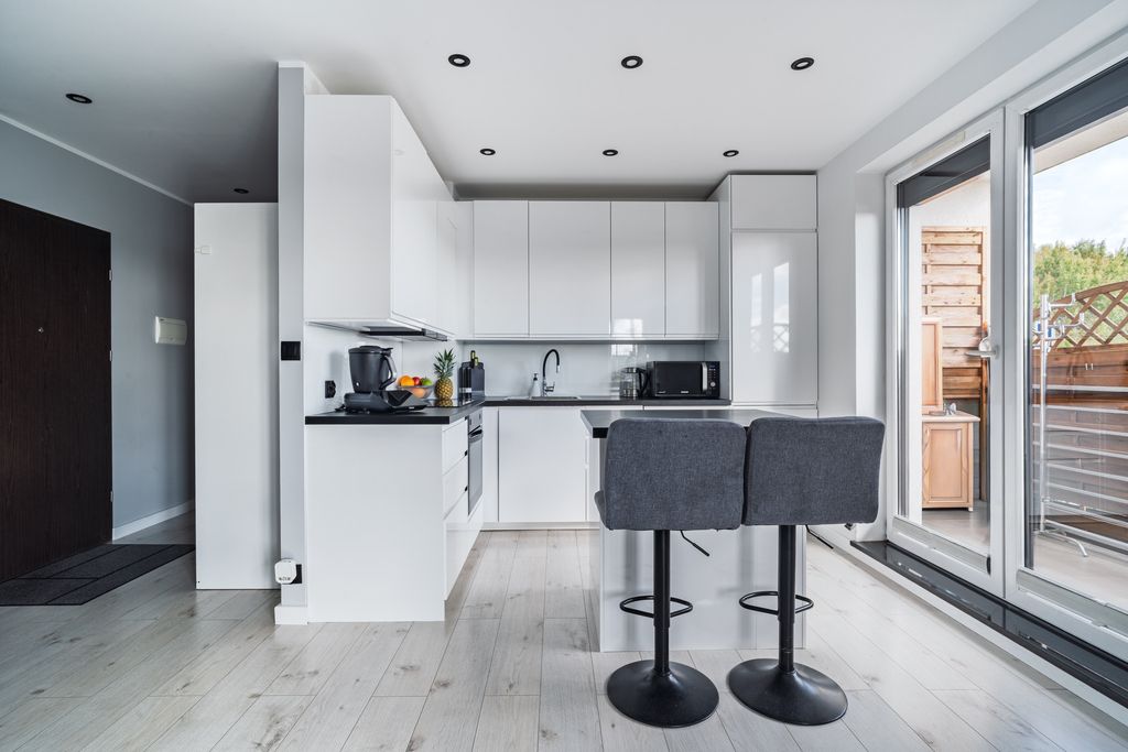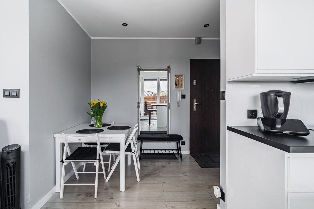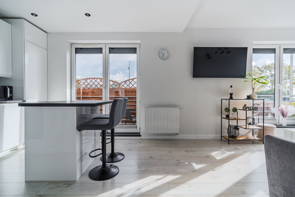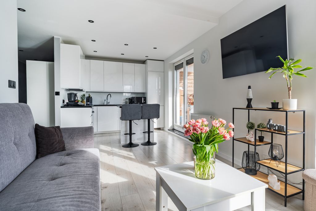 · przestronny salon z aneksem kuchennym i wyjściem na balkon