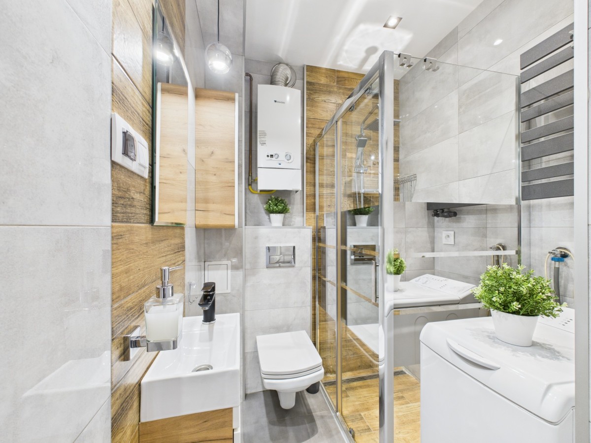 • Łazienka z WC i kabiną prysznicową - wnętrze niewielkie, ale zaprojektowane w przemyślany sposób