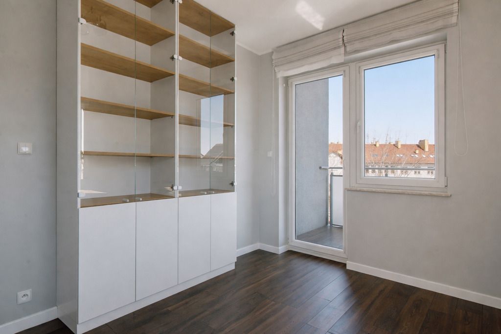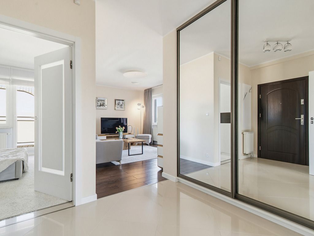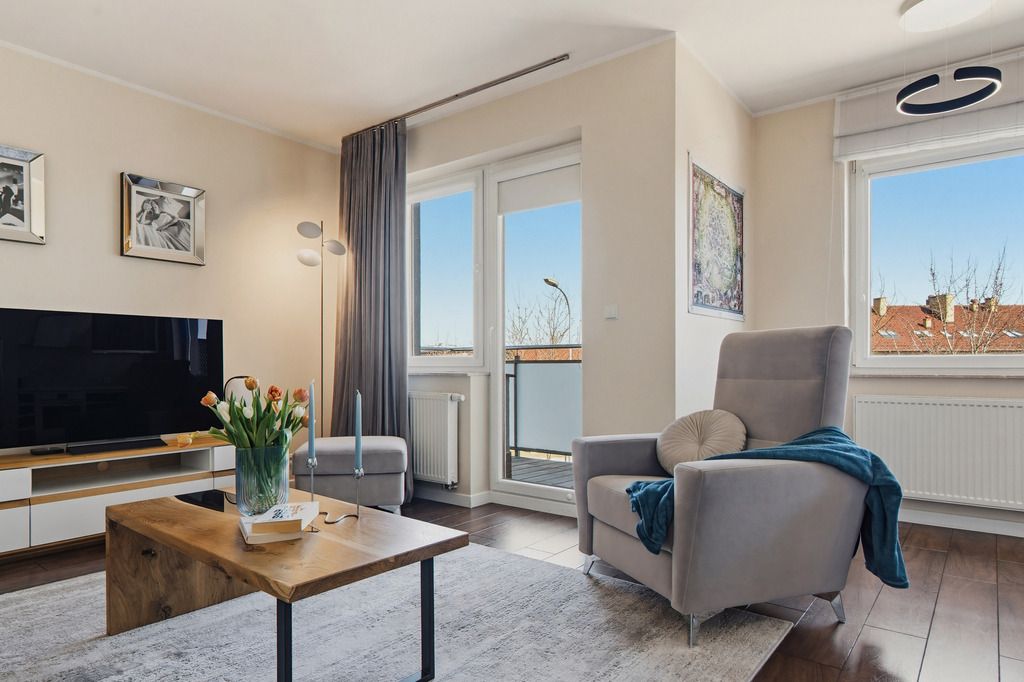 Dużym atutem jest dostęp do balkonów z każdego pomieszczenia, co daje poczucie swobody i dodatkową przestrzeń do spędzania czasu. Całość uzupełnia łazienka z prysznicem i ogrzewaniem podłogowym oraz przedpokój z pojemną zabudową, która pozwala utrzymać porządek bez kompromisów.