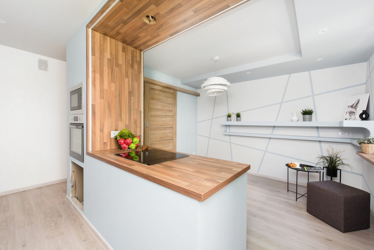 Układ: 2 pokoje, kuchnia w aneksie z wyspą, łazienka, przedpokój