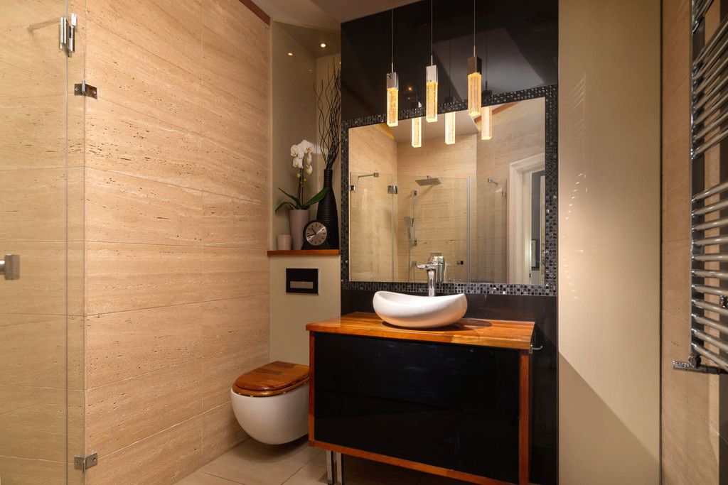 - Łazienka z dużym prysznicem, wykończona naturalnym trawertynem