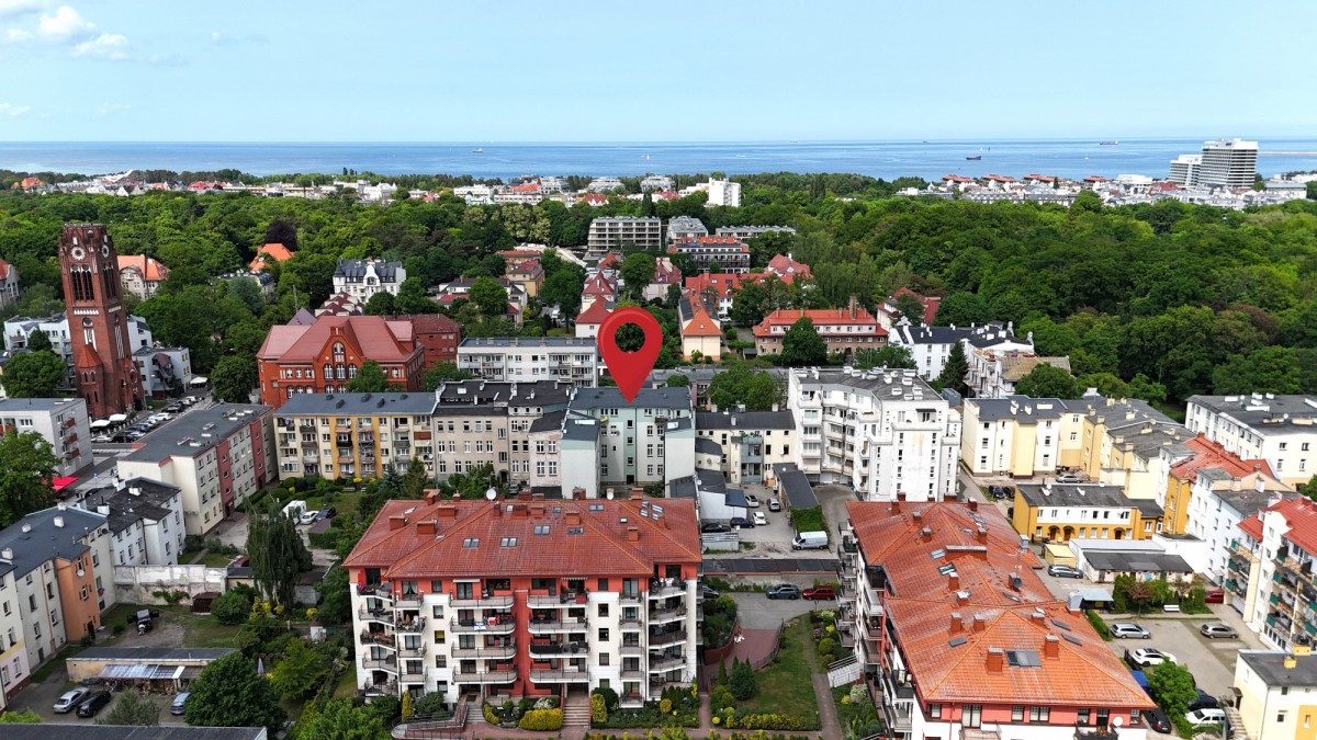 Mieszkanie położone jest w zielonej okolicy - do Parku Chopina mamy 200m, a do Parku Zdrojowego 450m. Najbliższy sklep typu Żabka oddalony jest o zaledwie 300m, w pobliżu znajdziemy też restauracje, przedszkola, liceum, place zabaw i liczne atrakcje Świnoujścia, m. in. Fontannę Śruba. Tuż obok budynku usytuowany jest przystanek skąd odjeżdżają autobusy linii 6 i A. Do promenady odległość wynosi 850m, a do Plaży 1km.