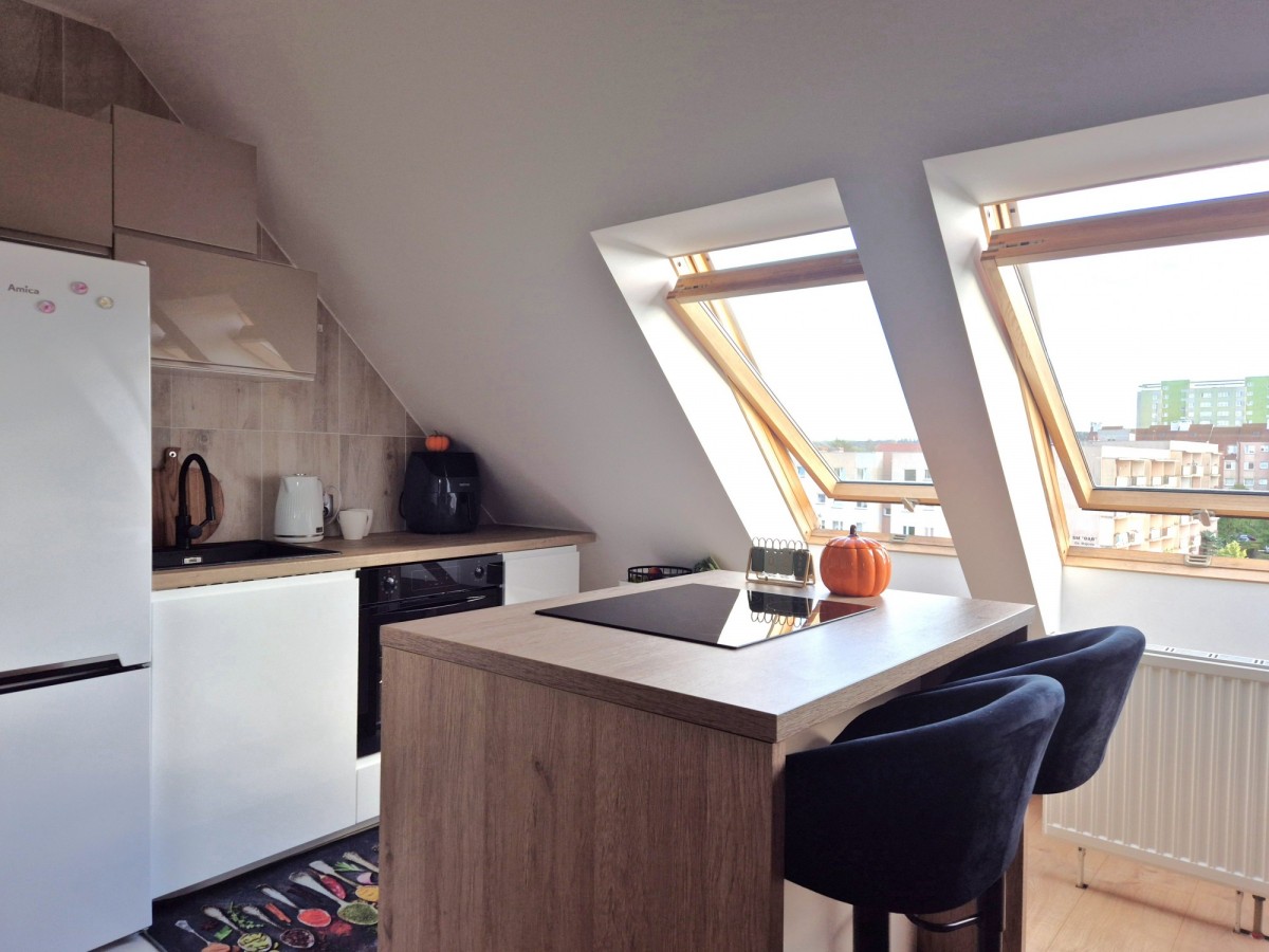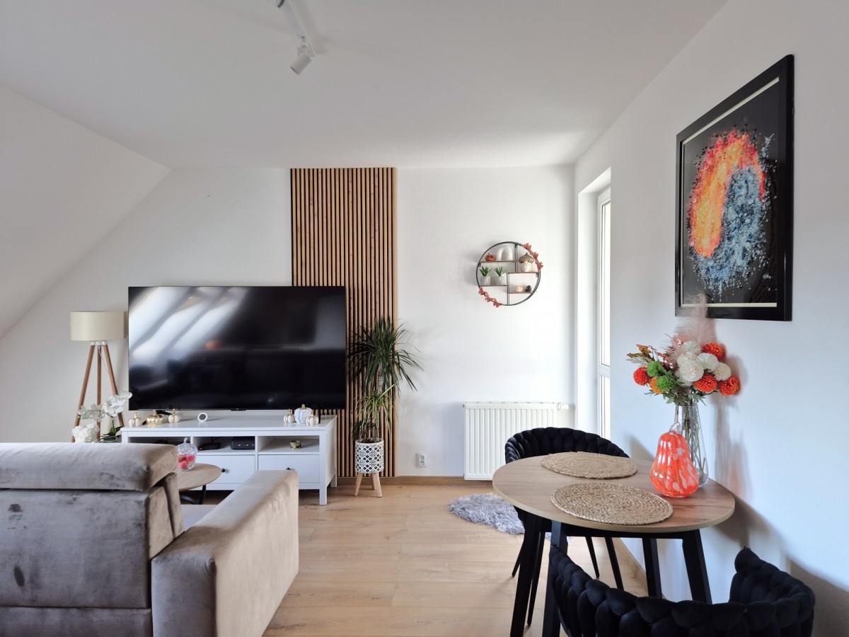 * salon z aneksem kuchennym, który został gruntownie odświeżony - zamontowano nowy blat, zlewozmywak granitowy Franke, wyspę kuchenną oraz wymieniono sprzęty AGD - lodówkę, płytę indukcyjną i piekarnik. Wszystkie sprzęty są jeszcze na gwarancji! W tym przytulnym salonie znalazło się miejsce na wygodną, narożnikową sofę oraz stół z krzesłami