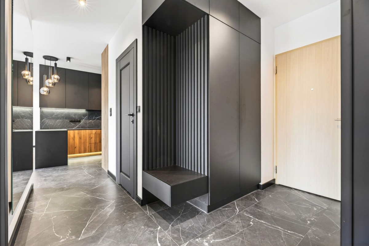 - jasną podłogą kontrastującą z ciemnymi elementami