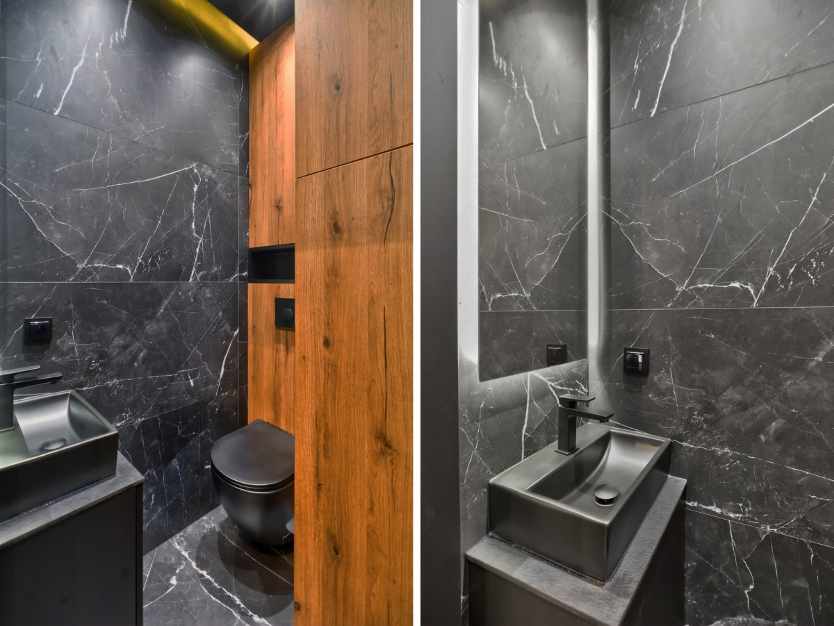 - zabudowa w połączeniu drewna i matowej czerni