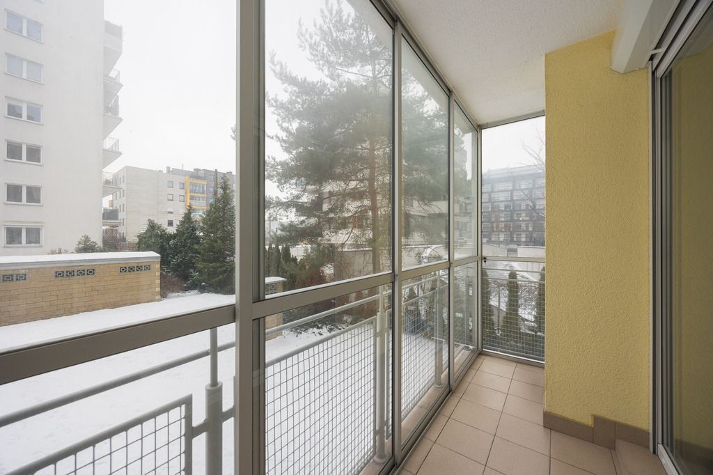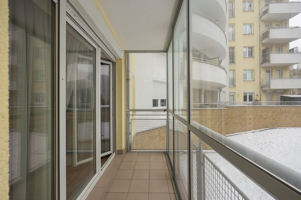 Mieszkanie posiada funkcjonalny układ pomieszczeń. Balkon jest oszklony z możliwością otwarcia, co pozwala korzystać z niego przez większą część roku. Lokal jest cichy, ponieważ okna wychodzą na wewnętrzne patio z zielonym trawnikiem i zadbaną przestrzenią wspólną, oddaloną od ruchu ulicznego.