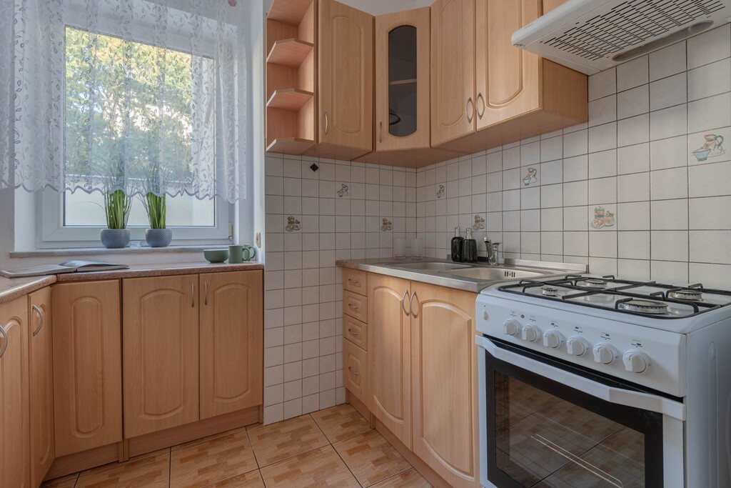 Oddzielna, widna kuchnia została w pełni wyposażona – znajdziemy tu lodówkę z zamrażarką, kuchenkę, piekarnik oraz liczne szafki i blaty robocze. Zapewnia komfort codziennego gotowania, a dzięki naturalnemu doświetleniu kuchnia jest przyjemnym i funkcjonalnym miejscem.