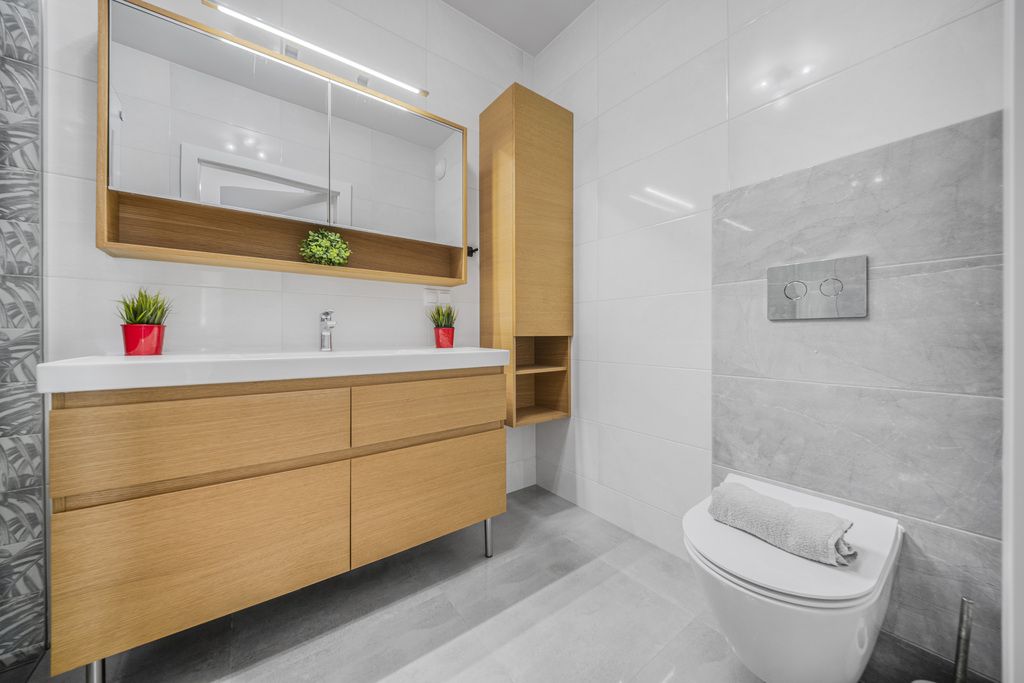 - łazienka z prysznicem typu walk-in, stelażem podtynkowym Cersanit, armaturą Grohe i Omnires, meblami fornirowanymi,