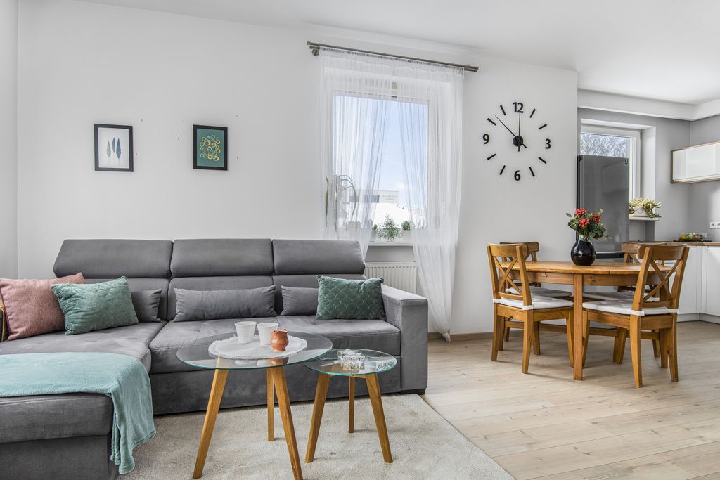 - salon (22 m2 wraz z 6,68 m2 aneksem) -przestronny a jednocześnie przytulny, utrzymany w jasnej, stonowanej kolorystyce. W salonie znajduje się rozkładany trzyosobowy narożnik, wygodny fotel i podwieszany telewizor. Stojący obok sporej wielkości stół z czterema krzesłami z powodzeniem pomieści wszystkich członków rodziny przy wspólnym posiłku lub podczas wieczornych rozmów czy gier planszowych.