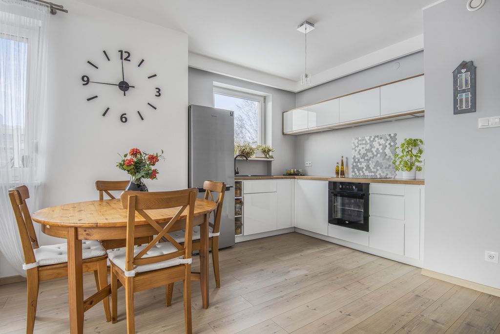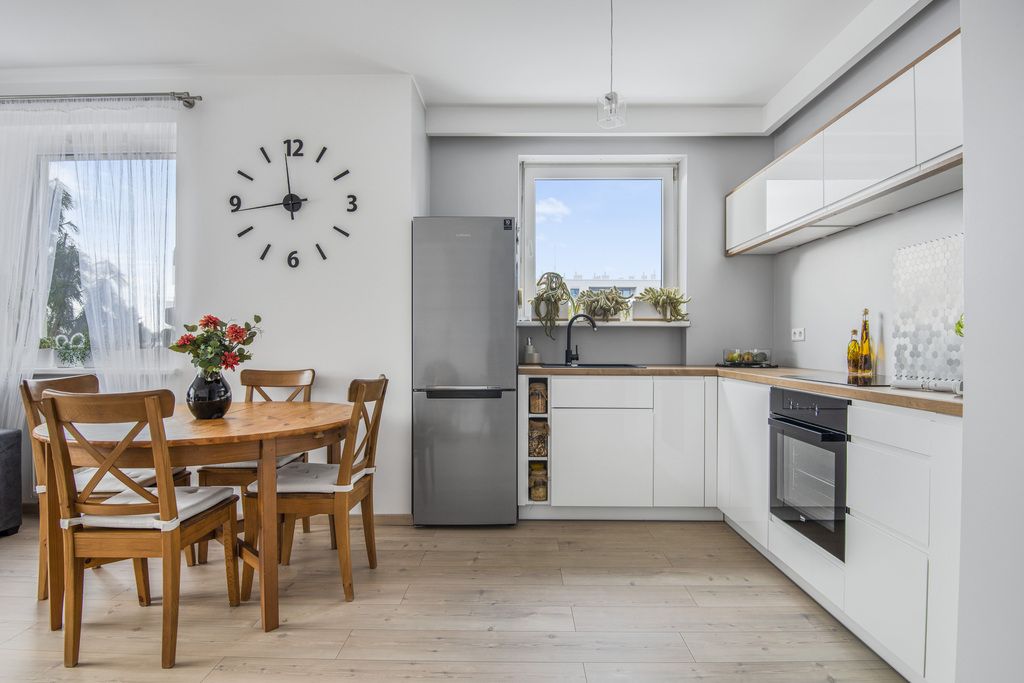 - kuchnia - w aneksie, dobrze zaprojektowana, stanowiąca dopełnienie salonu pod względem stylu i kolorystyki. Duża ilością szafek i szuflad do przechowywania oraz szerokie blaty robocze zapewniają funkcjonalność i komfort podczas przygotowywania posiłków. Kuchnia została wyposażona w niezbędne sprzęty AGD, w tym lodówkę z zamrażalką, płytę indukcyjną, piekarnik i zlewozmywak.