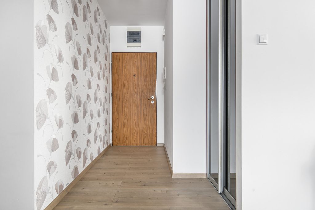 - przedpokój (9,94 m2)- na ścianie znajduje się tapeta z motywem miłorzębu japońskiego. Szafy w zabudowie wykonane na wymiar pomieszczą wszystkie najpotrzebniejsze rzeczy.