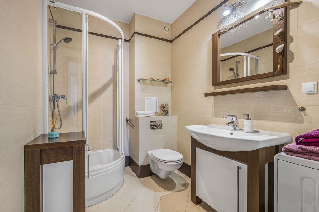 - łazienka (4,8 m2) - elegancka i stylowa, z prysznicem, umywalką, toaletą i pralką. Miejsce znalazły tu dodatkowe regały, które z łatwością pomieszczą najpotrzebniejsze kosmetyki i artykuły higieniczne.