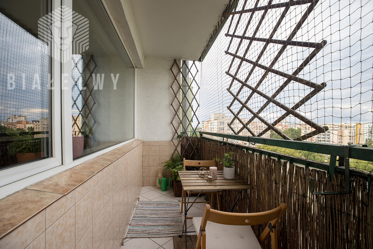 - Jasny salon z panoramicznym oknem i wyjściem na przestronną loggię - widok w kierunku Centrum Warszawy