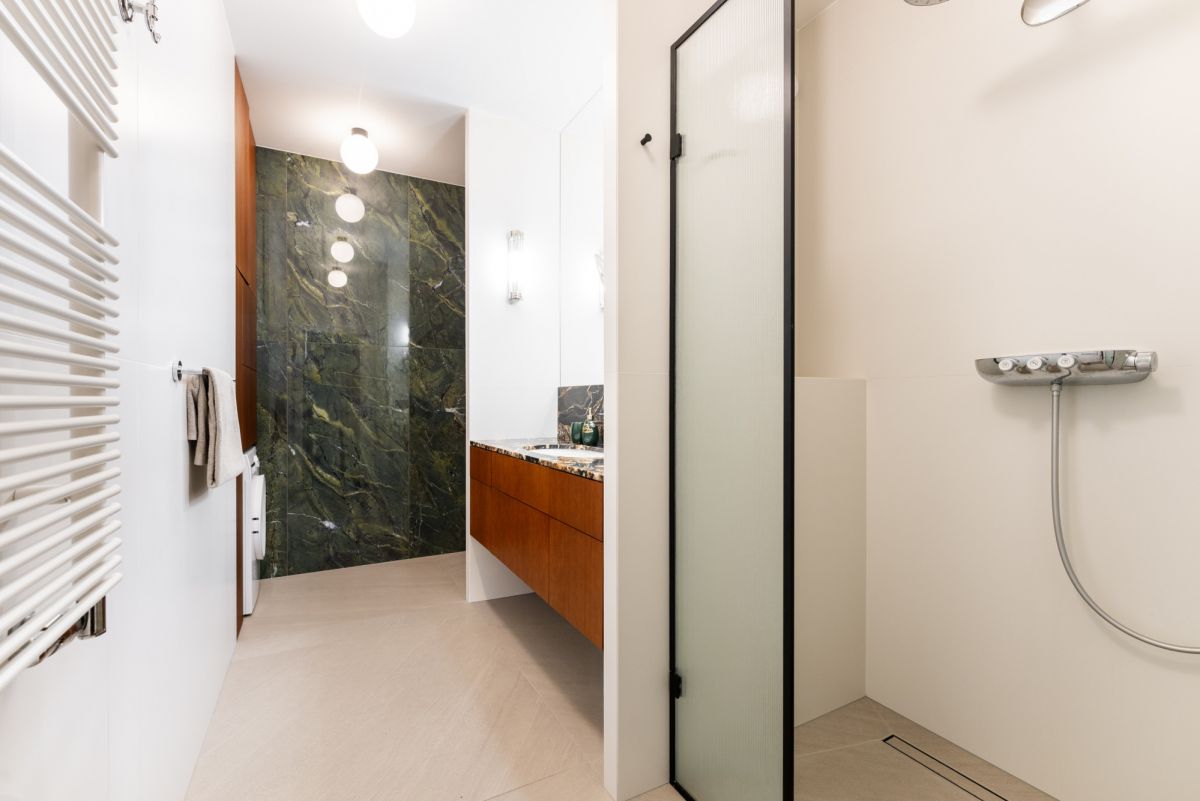 Apartament utrzymany jest w eleganckim, designerskim stylu i wykończony z wykorzystaniem wysokiej jakości materiałów. W apartamencie zastosowano stolarkę klasy Premium oraz meble wykonane na zamówienie. Panoramiczne okna zapewniają wyjątkowe doświetlenie wnętrz i tworzą niezwykłą oprawę dla widoku na miasto. Apartament jest w pełni umeblowany i wyposażony w sprzęt RTV i AGD. Trzy lata temu mieszkanie przeszło kompleksowe odświeżenie. Wnętrza zostały zaprojektowane z dbałością o detale oraz komfort codziennego użytkowania.